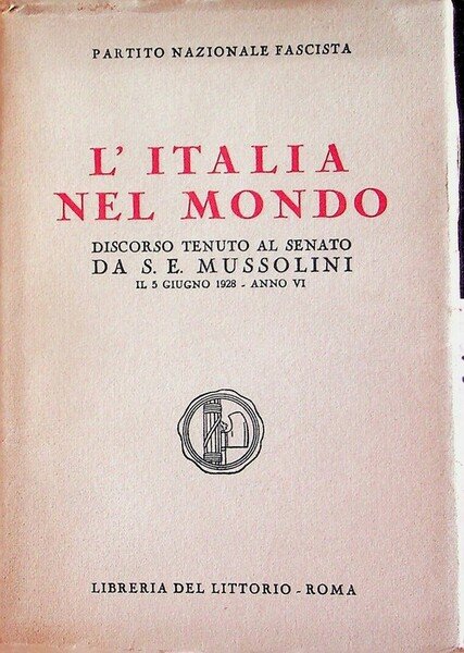 L'Italia nel mondo: discorso tenuto al senato da S. E. Mussolini il 5 giugno 1928 - Anno VI. BROSS. ANTERIORE STACCATA.