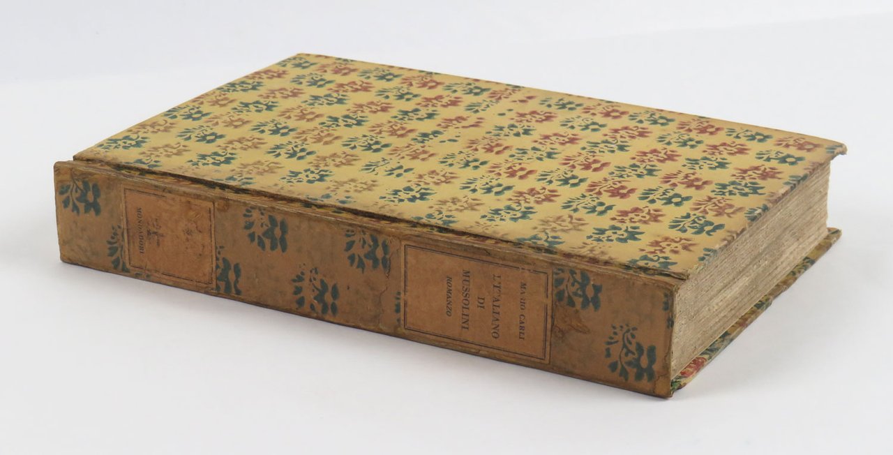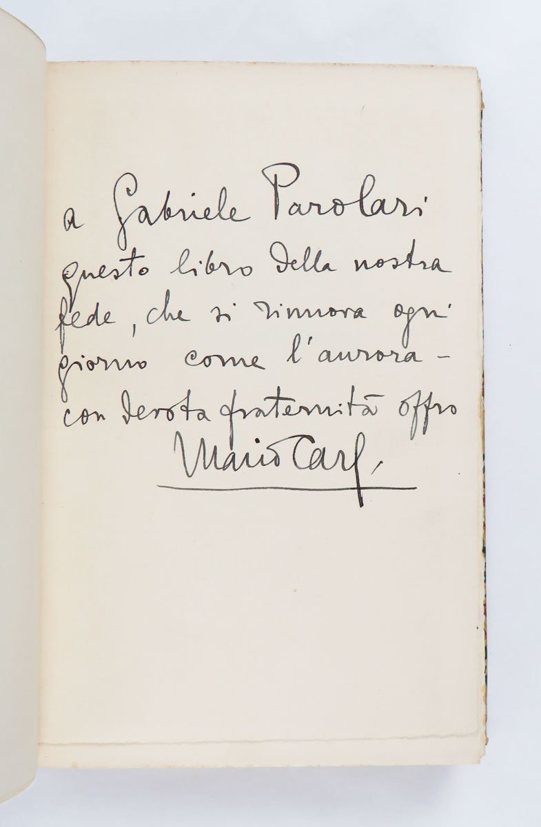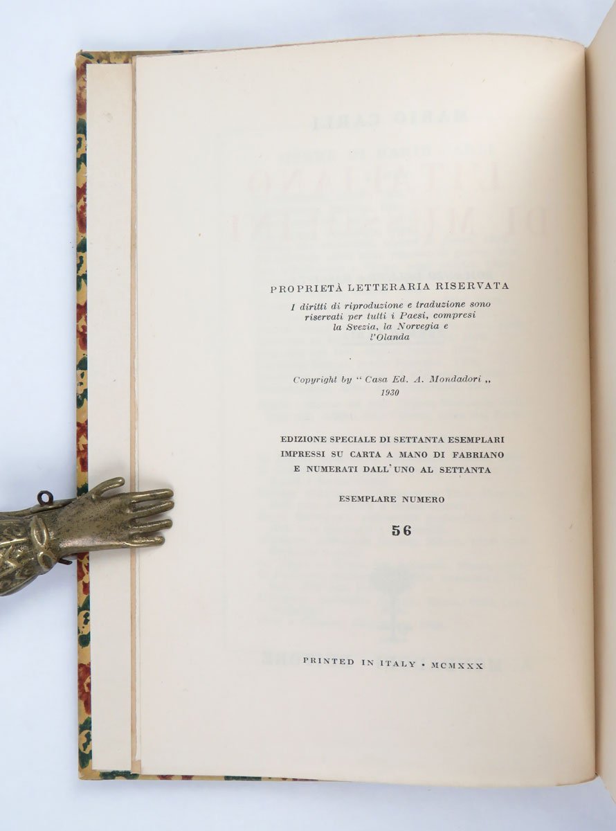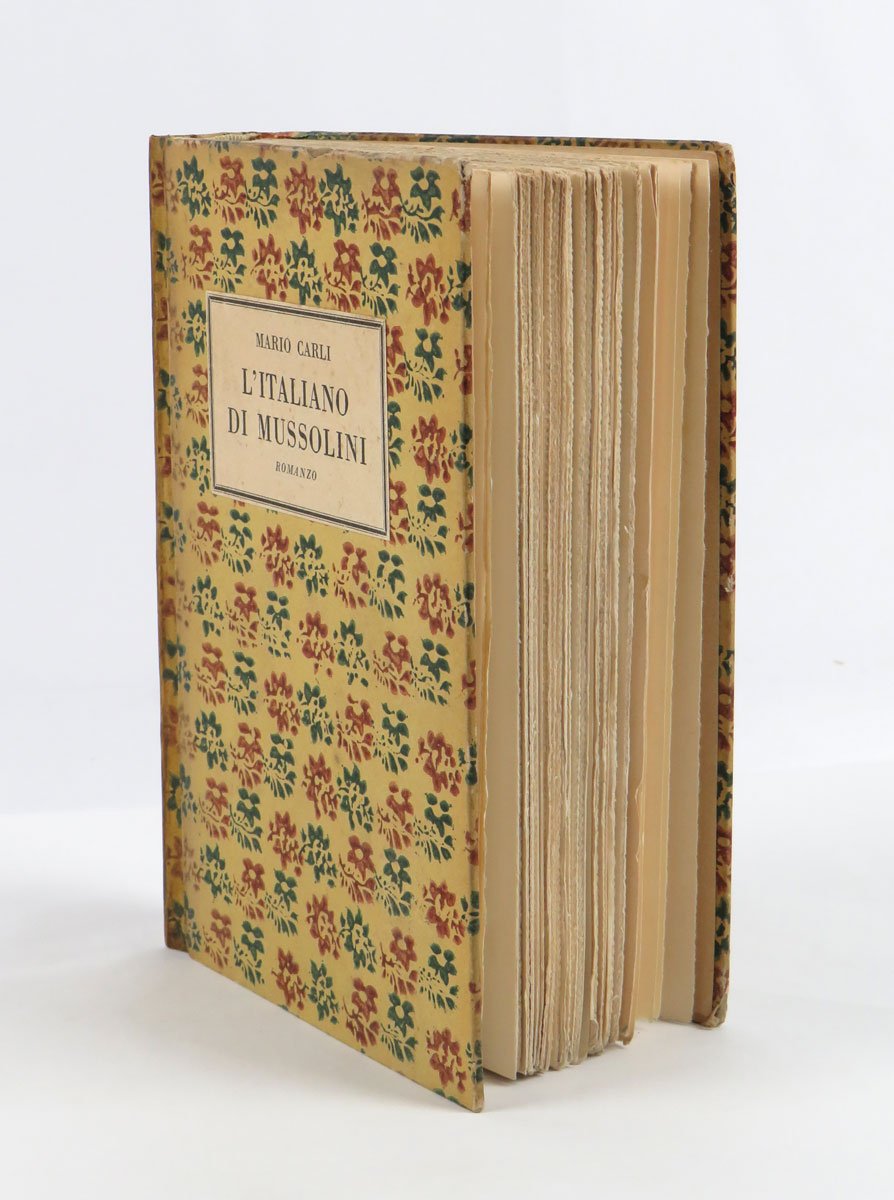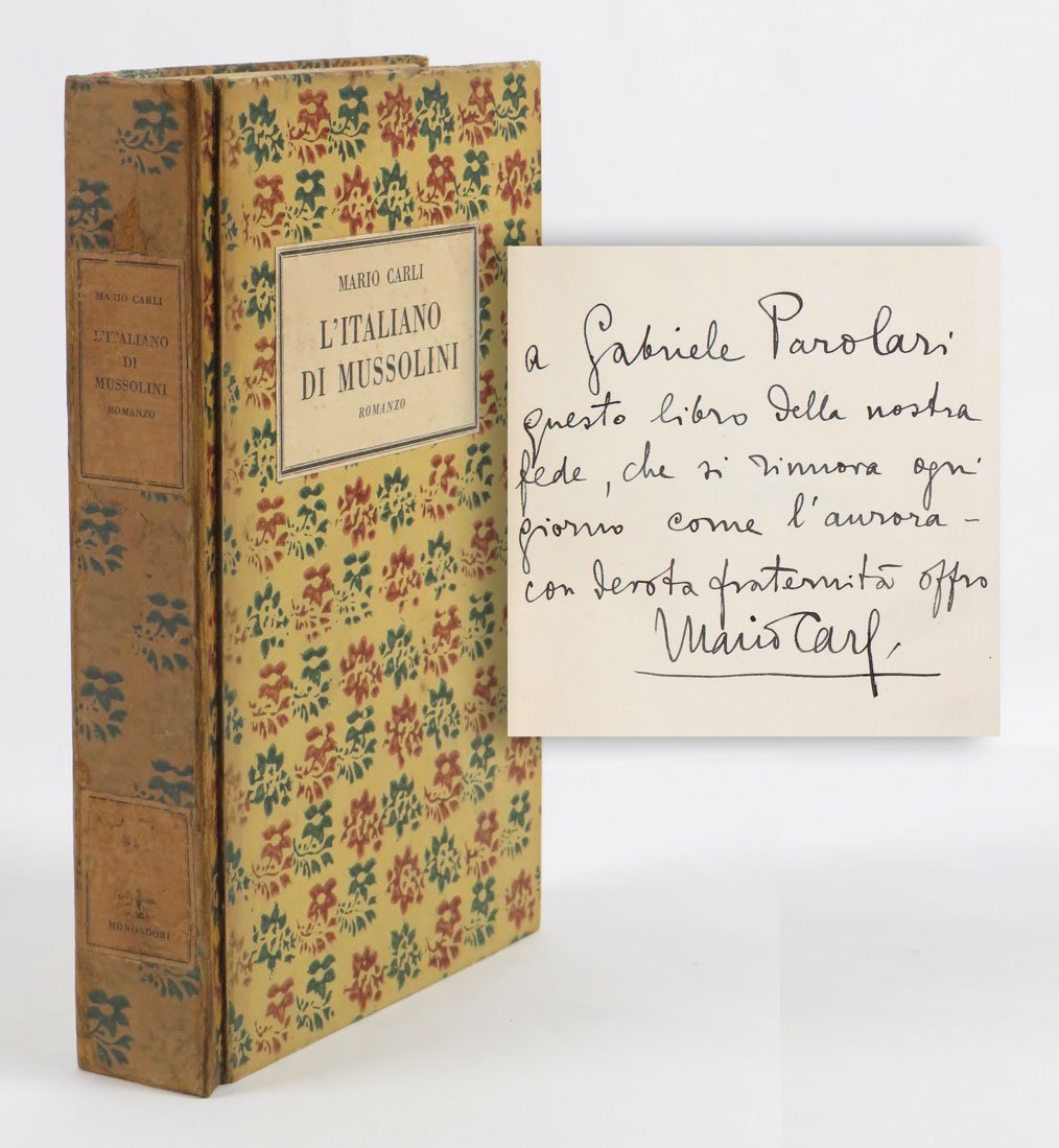 LIBROEdizione originale nella tiratura di testa.CON AUTOGRAFO.Esemplare numero 56 di soli 70, pregiato da dedica autografa dell’autore all’alpino e fiumano generale Gabriele Parolari (1890-1949): «a Gabriele Parolari questo libro della nostra fede, che si rinnova ogni giorno come l’aurora – con devota fraternità offro | Mario Carli»; brunito sul dorso e restaurato alle cerniere mantenendo gli elementi interamente originali; per il resto fresco e pulito, in complessive ottime condizioni.Rarissima tiratura di testa limitata a 70 esemplari numerati a macchina e stampati su pregiata carta a Mano Fabriano, nel tipico formato delle “grand papier” Mondadori di quegli anni. -- Culmine e sintesi delle due anime di Mario Carli, il brillante romanziere — da «Retroscena» a «Trillirì» — e l’ardito propagandista del fascismo, «L’italiano di Mussolini» inscena il contrasto ideale e irreale tra un’Italia “giolittiana” e la nuova Italia fascista in un romanzo blandamente fantascientifico (cfr. D. Cammarota, «Fantascienza», voce del Diz. Fut., p. 431a), ambientato in un generico futuro utopistico, specchio di un vagheggiato presente. Il romanzo ebbe un notevole successo, venendo tradotto in tedesco («Der Fascist», 1931), in francese («L’Italien de Mussolini», 1932) e in portoghese (si vedano i nn. 85.22-23 della bibliografia di Cammarota) e meritandosi una seconda edizione nei «Libri azzurri» Mondadori, uscita postuma con data 1937 e una lunga prefazione di Marinetti che ripercorreva la vita e le gesta dell’amico appena scomparso (Carli morì anzitempo nel settembre del 1935).Bibl. Cammarota, Futurismo, n. 85.19.