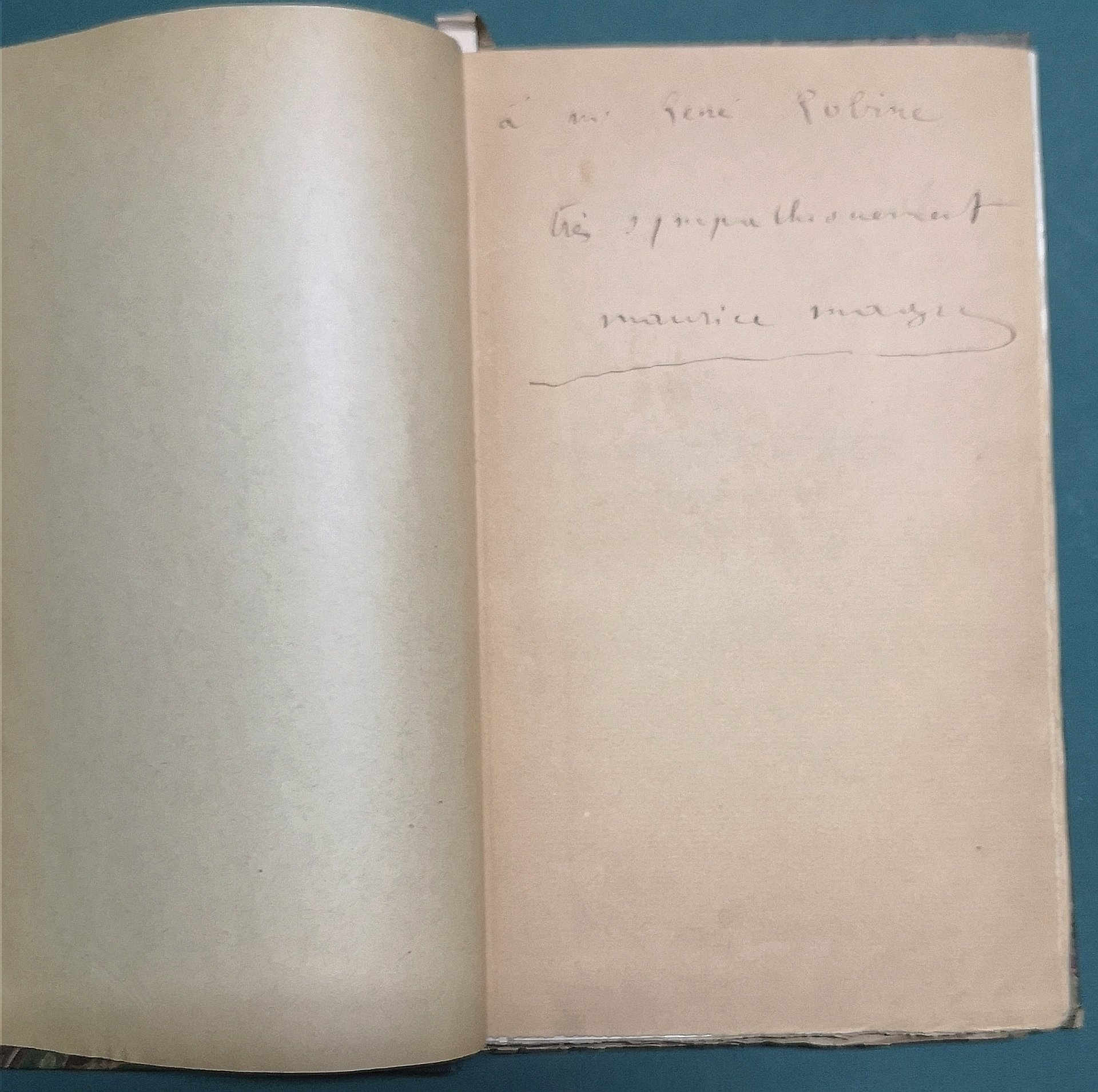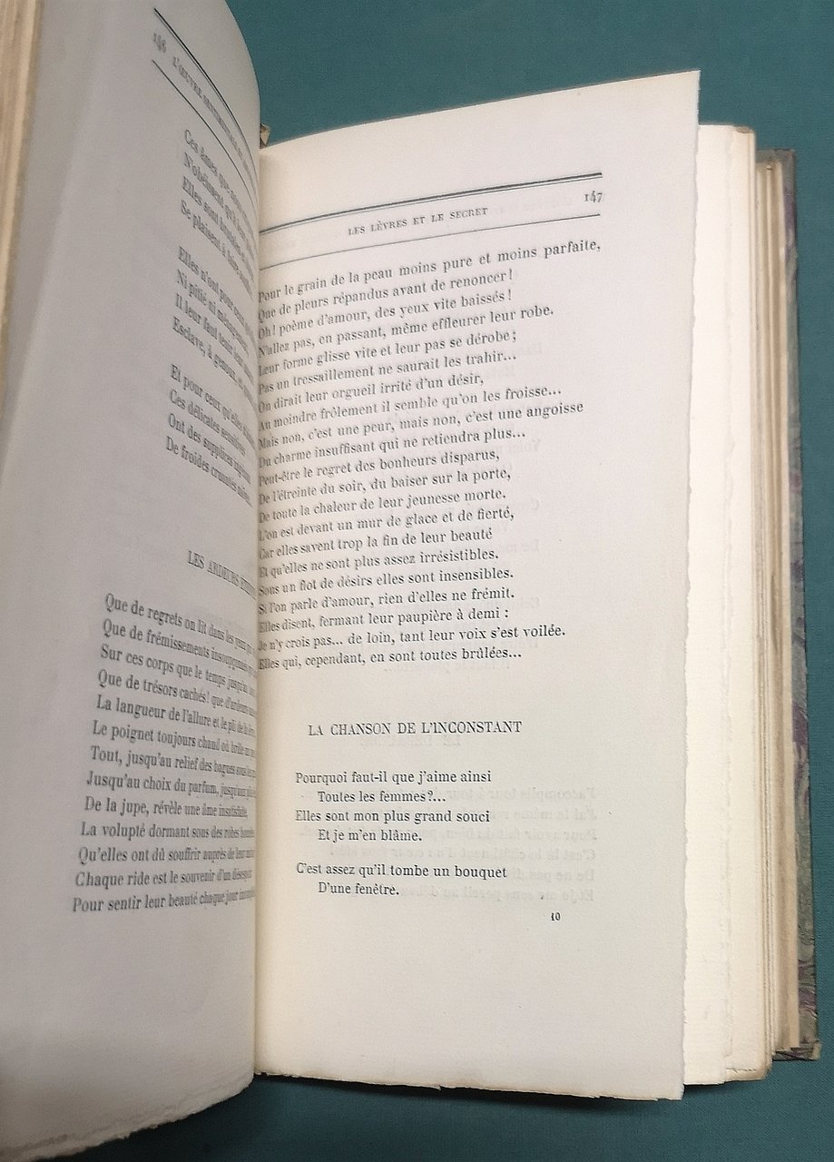 >in-8, pp. 254, (4 di reclame dell'editore), con 2 tavole f.t. di Chimat, di cui un ritratto in antiporta. Legatura in m. tela verde, titolo in oro al dorso. Vasta raccolta di poesie di Magre. Perfetto esemplare, freschissimo, in barbe, con dedica autografa dell'Autore.