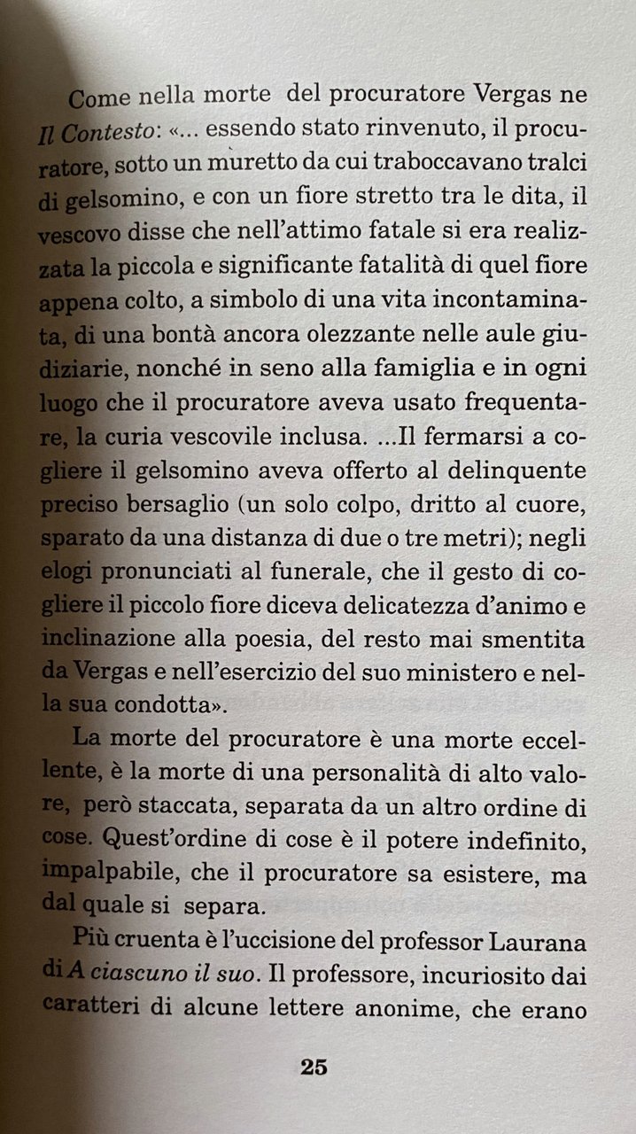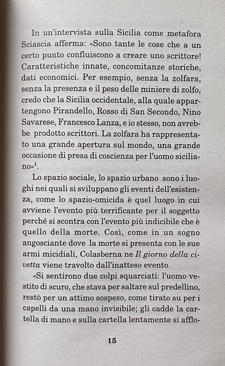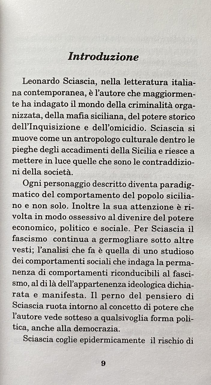 Soggetti: Critica letteraria Letteratura italiana Omicidio Morte Politica Genere poliziesco Analisi letteraria Interpretazione Personaggi Romanzi Storie Carattere Criminologia Criminalità organizzata Omertà Mafia Sicilia Famiglia Società Borghesia Chiesa Donne Sessualità Uomini Potere Economia Affari Cadaveri eccellenti Il Contesto Ispettore Rogas Indagini Gerarchie ecclesiastiche Todo modo Palermo Impegno politico Il giorno della civetta Professionisti Antimafia Christopher Duggan Racconti Gialli Il consiglio d'Egitto A ciascuno il suo Il contesto. Una parodia La strega e il capitano 1912 + 1 Il cavaliere e la morte Pirandello Pirandellismo Inquisitore Tulumello Delitti Porte aperte Pena Diritto Giustizia penale Romanzo Michele Pantaleone Calogero Vizzini Caltanissetta Lucky Luciano Fascismo Cesare Mori Chiesa Ciancimino Commissione Contadini Delitto Valter Vecellio Villalba Sbarco Magistratura Emanuele Macaluso Giuseppe Genco Russo Don Calò Gaetano Carabinieri Cascio Ferro Simbolismo metafora Saggistica Libri rari fuori catalogo Collezionismo Sentenza memorabile Processo Inquisitorio Strega Radici storiche Storia semplice Spazio sociale Silenzio simbolico Fisiognomica Conflitto sociale Donna Relazioni Archetipi Sociologia Miniere Zolfo Zolfara Francesco Lanza Immaginario religioso Materialismo Mistero Contessa Maria Tiepolo Ideologia Pugnalatori Capro espiatorio Calogero Di Bella Complotto Commissario Vargas Lettere anonime Sesso Brigadiere Polizia Parassitismo Ricatto Colasberna Noir Bibliografia Consultazione Psicologia Sofisticazione sessuale Storia Invasioni Violenze Sopraffazione Dominazione Catapano Barruggieddu Legge Popolo Prepotenza Abuso Stato Burocrazia Laurana Benito Bellodi don Mariano Comunismo PCI Procuratore Riches Connivenze Corruzione Roccella Davide Lajolo Interviste Conversazioni Detective Hard boiled Literary criticism Italian literature Murder Death Politics Detective genre Literary analysis Interpretation Characters Novels Stories Character Criminology Organized crime Omertà Sicily Family Society Bourgeoisie Church Women Sexuality Men Power Economy Business Excellent corpses The Context Inspector Investigations Ecclesiastical hierarchies Political commitment The day of the owl Professionals Anti-mafia Mystery stories The council of Egypt To each his own The context A parody The witch and the captain The knight and death Inquisitor Crimes Open doors Punishment Law Criminal justice Novel Fascism Church Ciancimino Farmers' Commission Crime Landing Judiciary Symbolism metaphor Non-fiction Rare books out of print Collectibles Memorable sentence Inquisitorial trial Witch Historical roots Simple history Social space Symbolic silence Physiognomy Social conflict Woman Relationships Archetypes Sociology Mines Sulphur Sulphur mine Religious imagination Materialism Mystery Countess Ideology Stabbers Goat scapegoat Conspiracy Commissioner Vargas Anonymous letters Sex Police Parasitism Blackmail Bibliography Consultation Psychology Sexual sophistication History Invasions Violence Abuse Domination Law People Bullying Abuse State Bureaucracy Communism Prosecutor Connivance Corruption Interviews Conversations