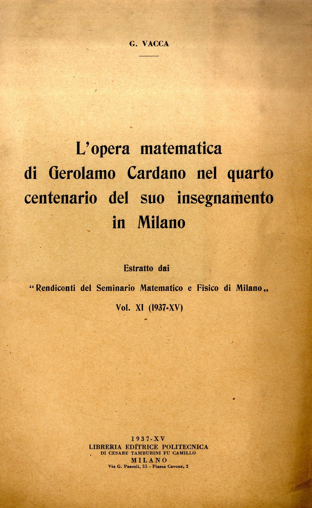 L'opera matematica di Gerolamo Cardano nel quarto centenario del suo insegnamento in Milano
