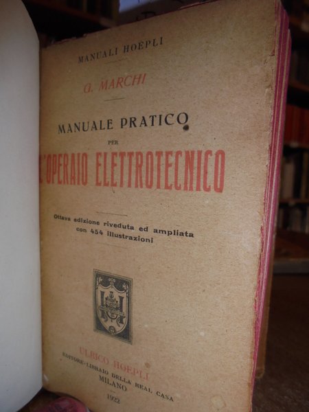 G. Marchi. Milano, Ulrico Hoepli, 1922. L' operaio elettrotecnico. Ottava edizione riveduta ed ampliata. In-16° piccolo, cartonato edit. con titoli sul piano e al dorso, tagli colorati in rosso. xx, 779 pp. con 454 illustrazioni n.t. Esemplare ben conservato con uniforme brunitura delle pagine. Neg. man. Hoepli.