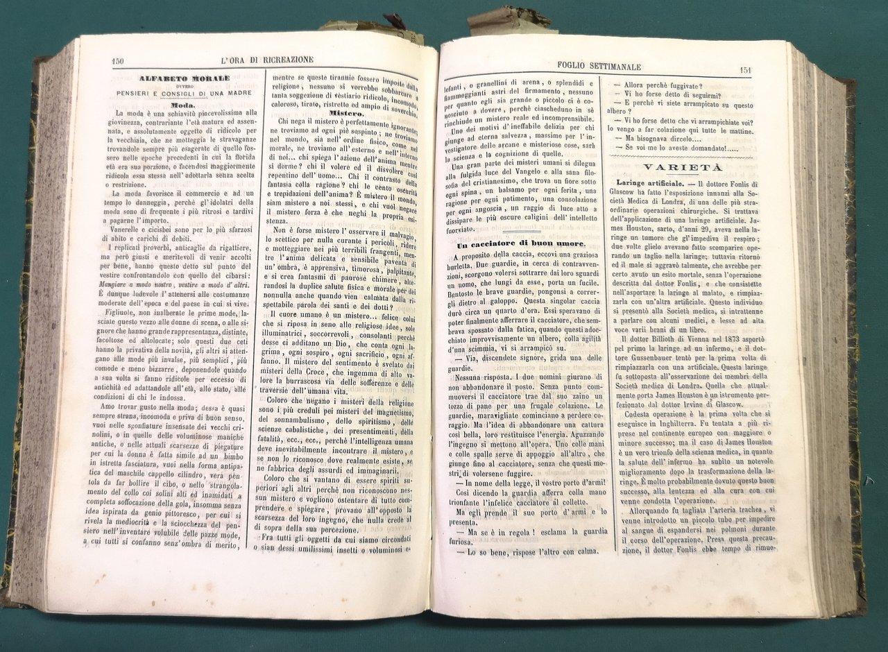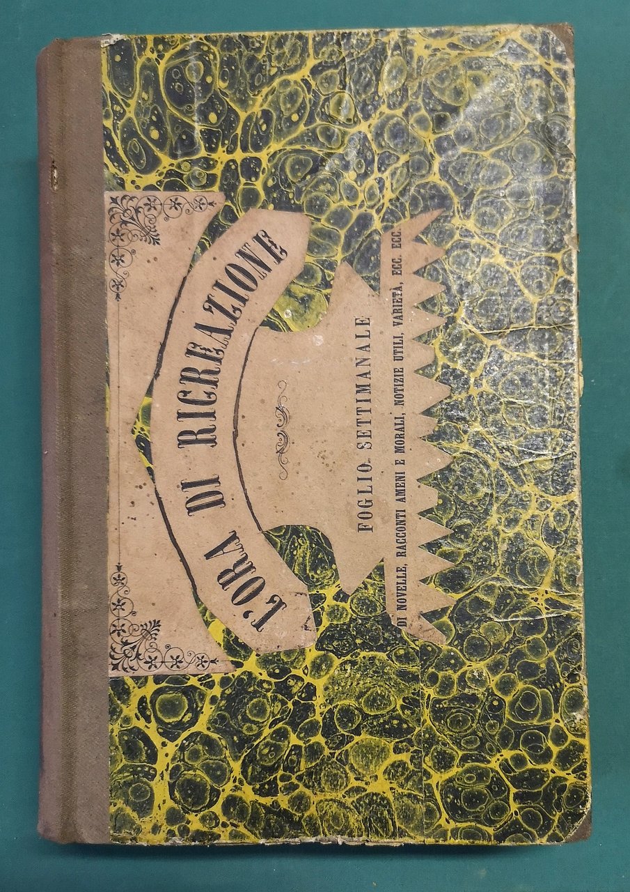 >3 voll. in 1 tomo in-4, pp. 416; 420; VIII, 416; testo su due colonne. Legatura coeva in m. tela con titolo ms. al dorso, piatti in carta decorata e titolo in carta applicato al piatto ant., tagli spruzzati. Tre annate complete di questa rivista settimanale, supplemento al periodico religioso "La Buona settimana", che presenta racconti a puntate, novelle, notizie curiose, sciarade, poesie, epigrammi e indovinelli. Non comune. Buon esemplare, sporadiche bruniture.