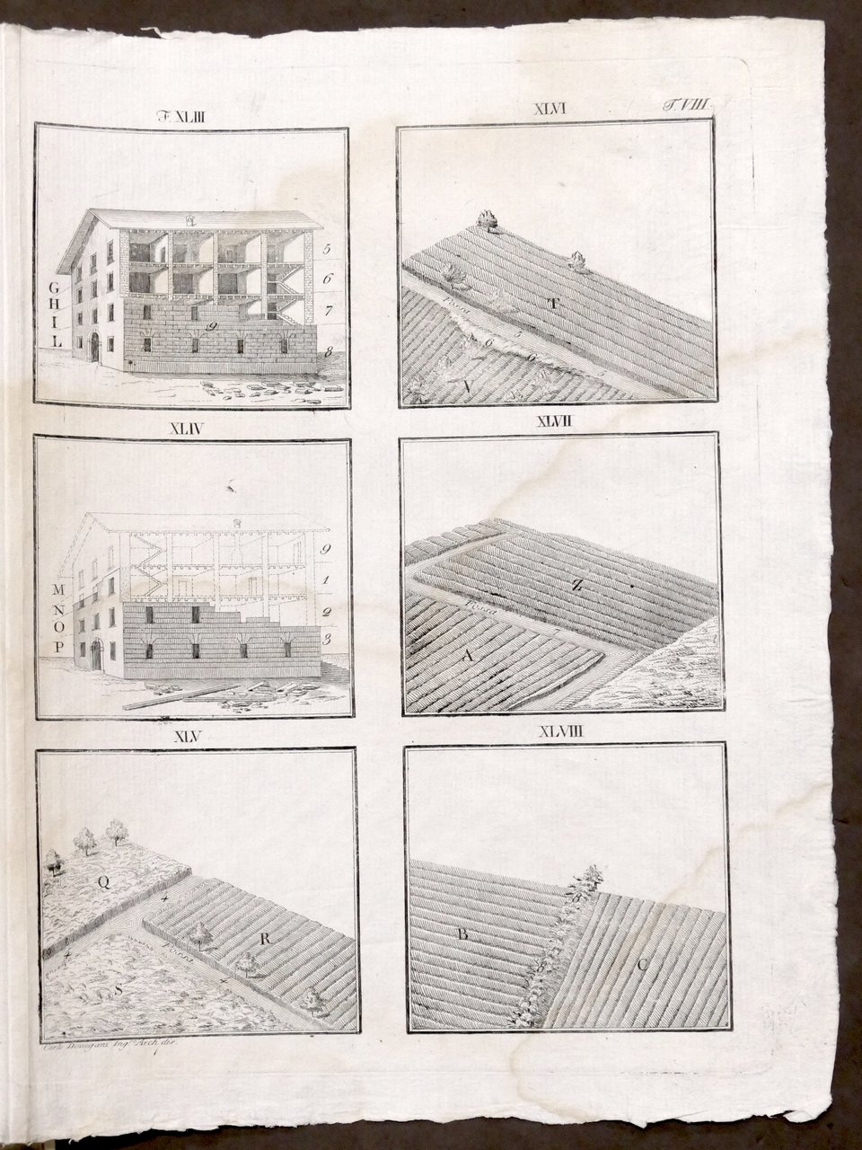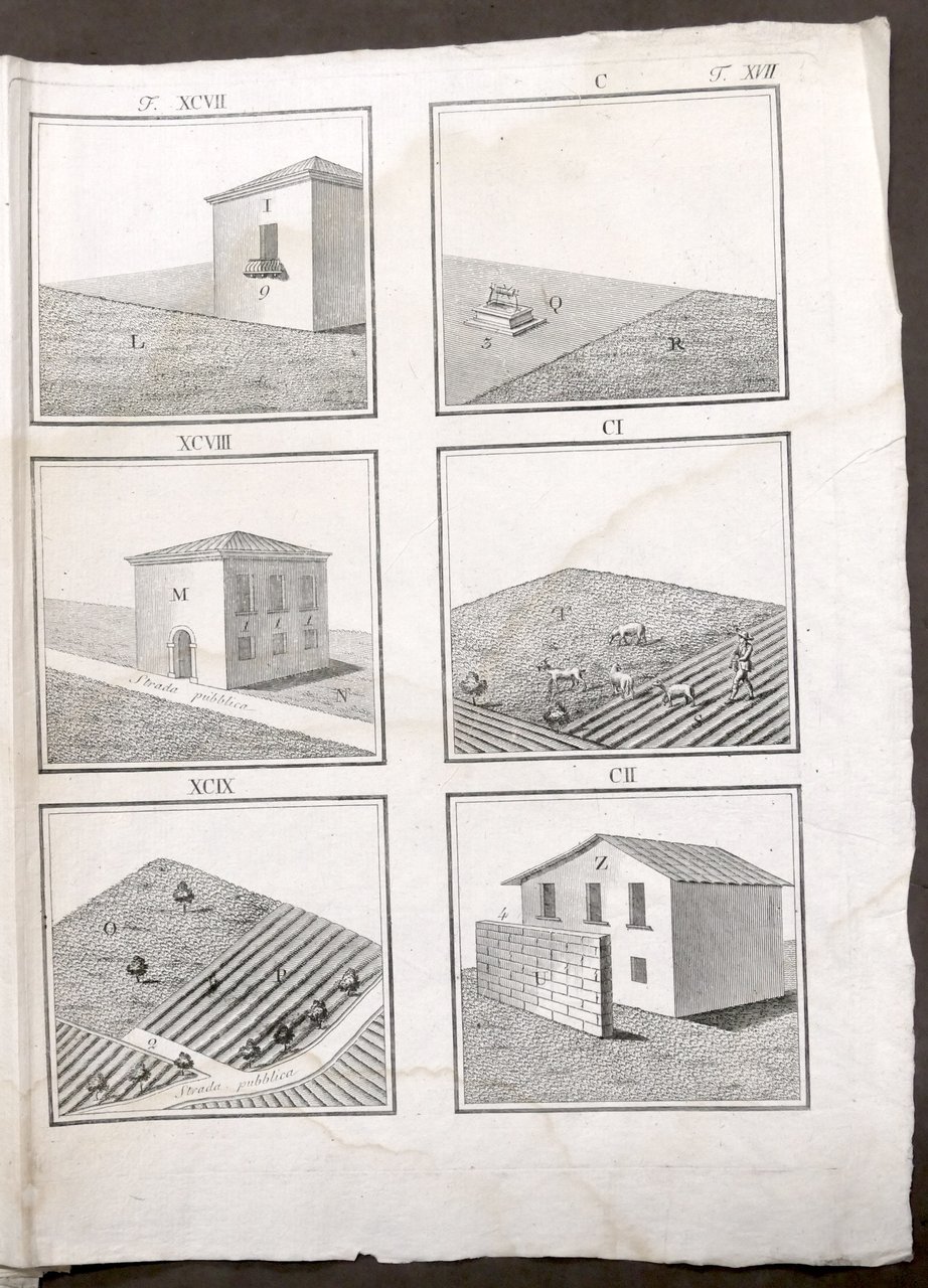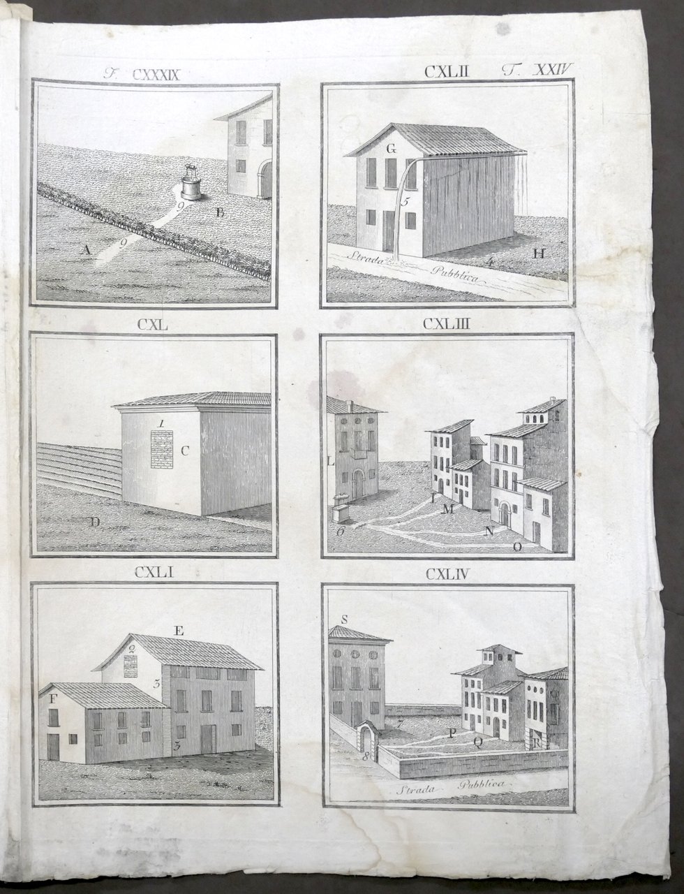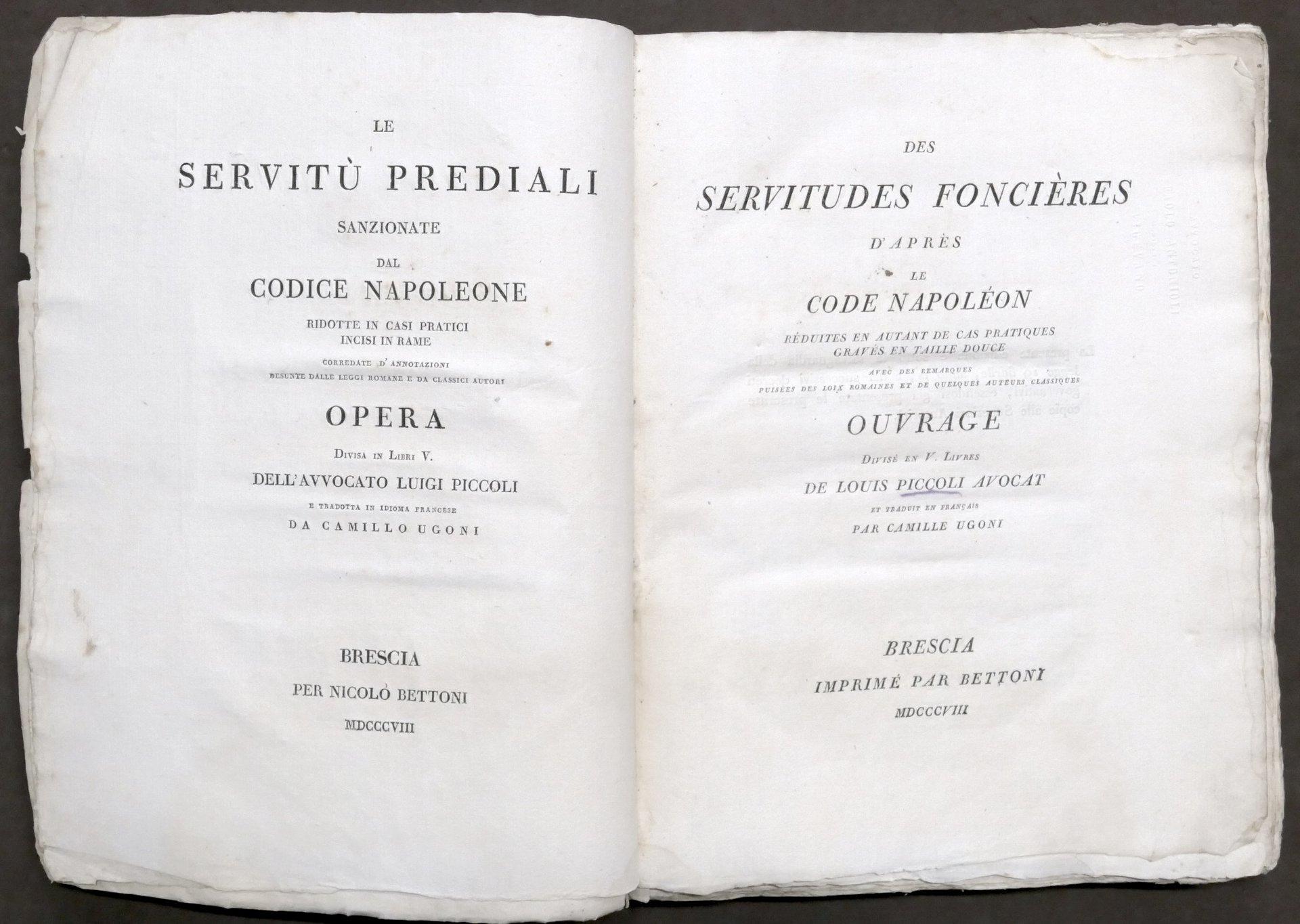 Le servitù prediali sanzionate dal Codice Napoleone ridotte in casi pratici incisi in rame corredate d'annotazioni desunte dalle leggi romane e da classici autori. Opera divisa in libri V. dell'avvocato Luigi Piccoli e tradotta in idioma francese da Camillo Ugoni Brescia, per Nicolò Bettoni, 1^ ed. 1808 Pag. LV, [1], 127, [1] 24 tavole calcografiche ripiegate in fine, disegnate da Carlo Donegani e incise da Pietro Berceni. Copertina morbida - Testo in italiano e francese. Condizioni generali buone. Qualche traccia di umidità . Copertina come da foto. Â