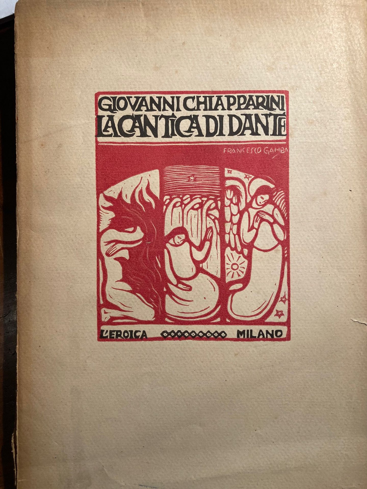 In-4° (26x18 cm), pp. 168 (8), brossura editoriale con titoli neri al piatto anteriore con illustrazione silografica rossa di Francesco Gamba ripetuta in nero al frontespizio. Silografie virate rosse di Gamba. Testo stampato entro filetto tipografico continuo rosso. Lievi segni del tempo e d' uso ai piatti, al dorso (brunito e con restauro), lievissime fioriture alle carte bianche. Interno fresco. Più che buon esemplare intonso. Edizione originale di questo poema che indaga gli aspetti politici e civili della vita e delle opere del Sommo Poeta.