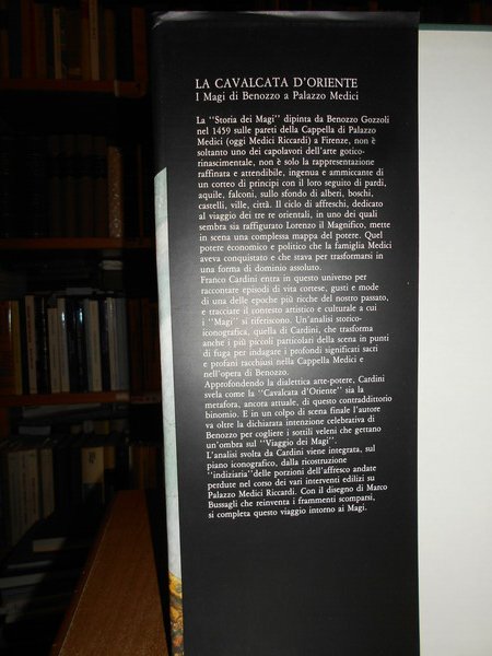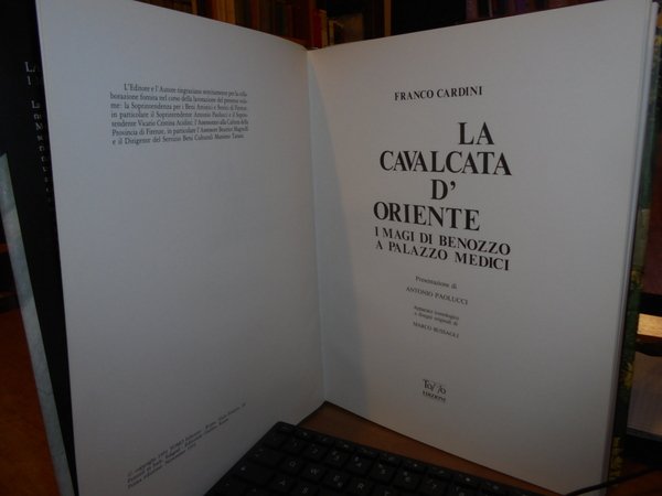 CARDINI FRANCO. Roma, Tomo Edizioni, 1991. La Cavalcata d' Oriente. I Magi di Benozzo a Palazzo Medici. Presentazione di Antonio Paolucci. In-4°, tela edit. verde con titoli in oro impressi sul piano e al dorso, sovracopertina ill. a col. 173 pp. con numerose illustrazioni a colori e in bianco e nero nel testo. In ottimo stato di conservazione. Uff. stanzetta mob. a sinistra 2 carc.