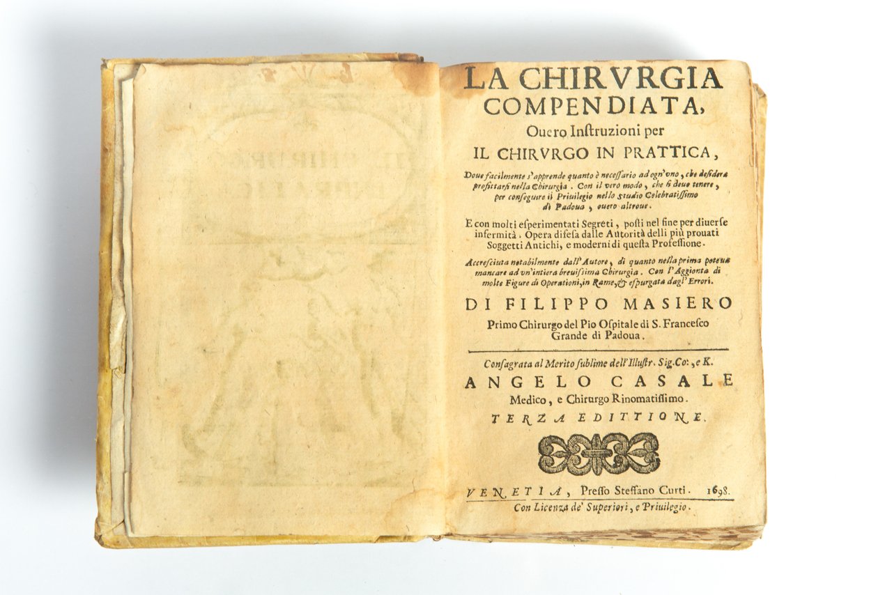 In-8, mm 145, pp. (32), 414, (2), con un'antiporta incisa e 14 tavole fuori testo, capilettera, testatine e finalini silografici. Alla p. 294 è rappresentata una testa d'uomo sottoposta all'operazione dell'arteriotomia. Legatura coeva in piena pergamena con tre nervi passanti, titolo manoscritto al dorso, tagli marezzati. Buon'esemplare nonostante la rifilatura del margine superiore che assai occasionalmente sfiora le lettere di richiamo dei capitoli (non più di una decina di carte interessate), un paio di annotazioni manoscritte alle pp. 64 e 280. Carte uniformemente ingiallite. Terza edizione identica alla seconda del 1690 sempre stampata dal Curti a Venezia, editore anche della princeps nel 1688 senza le tavole incise. Bibliografia: Wellcome IV, p. 74; Krivatsky, 7528, non in Garrison Morton. Censimento: tutte le biblioteche (OCLC e ICCU) non registrano quest'edizione, ma solo la prima e la seconda edizione.. *** TUTTI I NOSTRI LIBRI SONO VISIBILI PREVIO CONTATTO MAIL O TELEFONO NELLA NUOVA SEDE DI MILANO: LIBRERIA COSMOPOLIS, VIA JOMMELLI, 22. ***