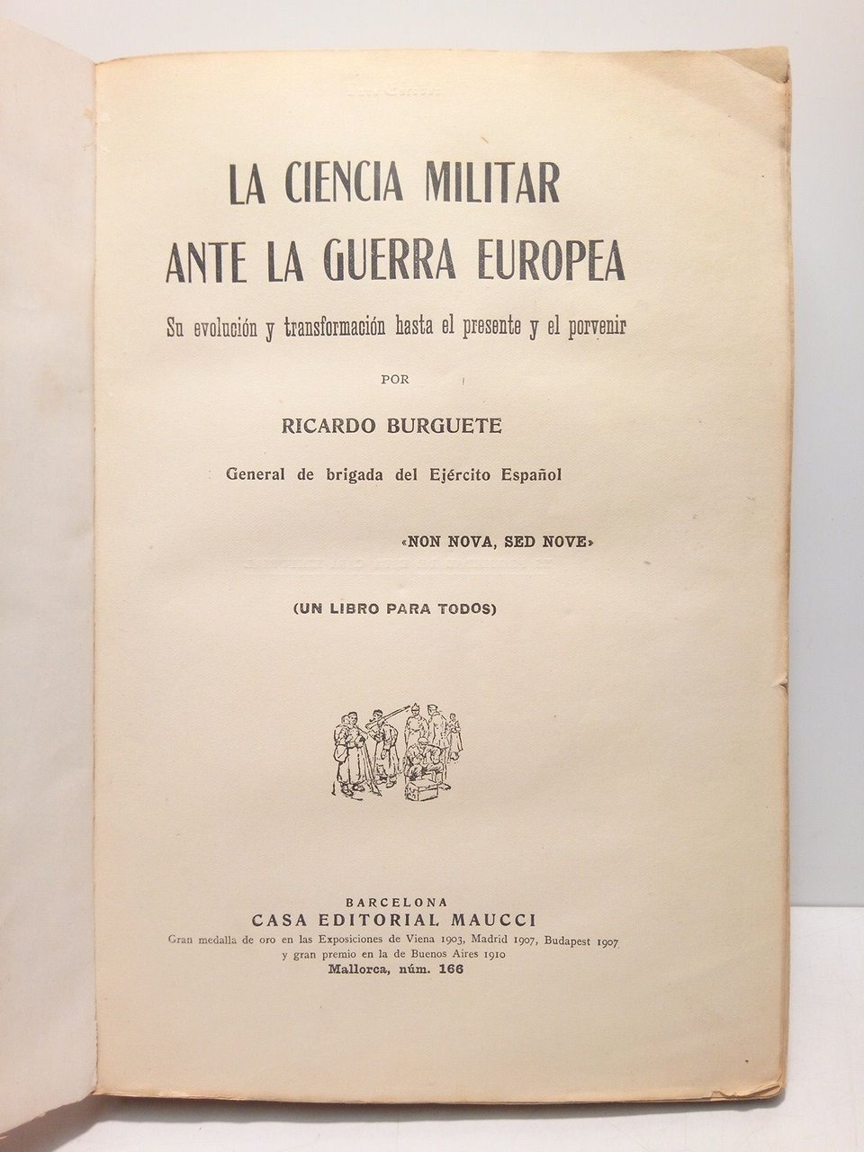 Barcelona: Casa Ed. Maucci, [ca. 1917].- 615 p.: Ante la portada, retrato de cuerpo entero del autor, e ilustraciones entre el texto; 4º (25 x 17,5 cm); Excelente impresión sobre papel de muy buena calidad de tono ahuesado, con artísticas letras capitulares; Rústica Ed.* Lomo refarzado, cubiertas algo sucias y con pequeñas faltas en los bordes. Interior muy bién. EJÉRCITO Y TEMAS MILITARES