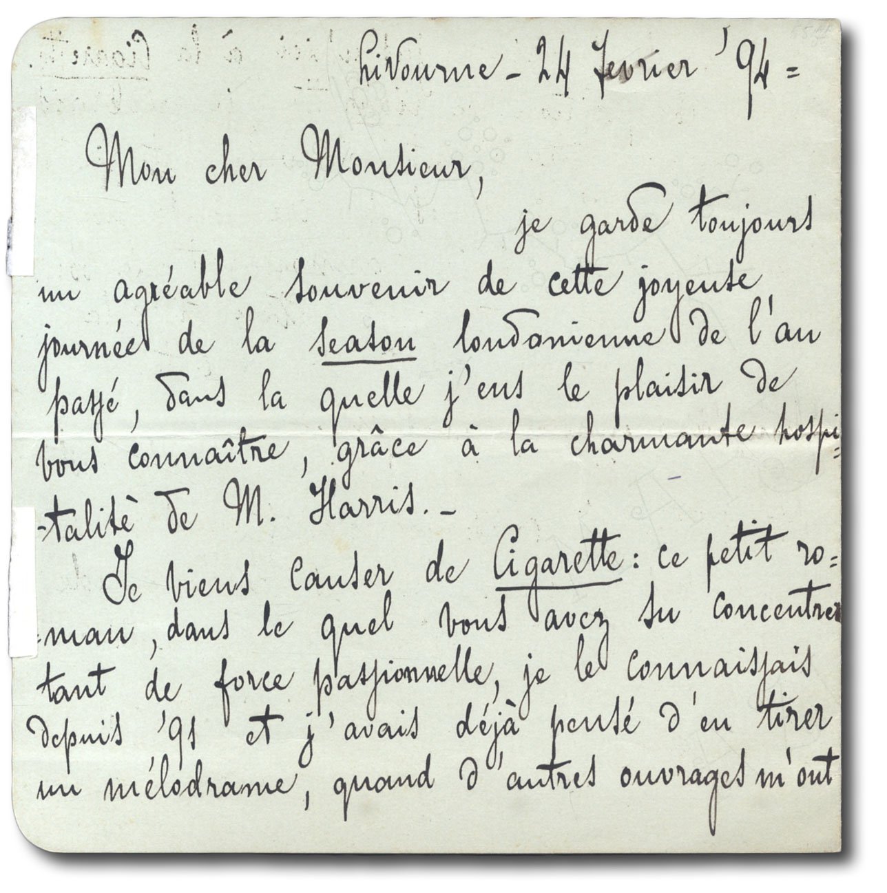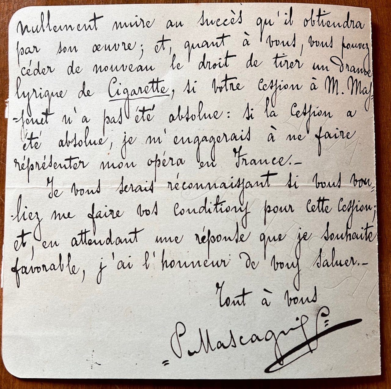 >4 pagine in-12 carré (153x153 mm), vergate in francese in chiara grafia su carta azzurrina. La lettera firmata "P. Mascagni"è inviata dal compositore a Jules Claretie (letterato e giornalista francese, dal 1885 esponente di rilievo della Comédie Française e dal 1888 membro dell'Accademia). L'intento del Mascagni è quello di musicare il romanzo "La Cigarette" di Claretie (apparso a stampa nel 1890). Il compositore, polemizza contro la stampa, in quanto era circolata la voce che tale permesso fosse già stato accordato a Massenet (1842-1912): ''..je viens causer de Cigarette: ce petit roman..j'avais déjà pensé d'en tirer un mélodrame..mais je viens de lire dans quelques journaux un entrefilet annonçant que vous m'avez refusé votre autorisation et conséquemment vous avez déjà donné cette permission à l'illustre Massenet''. Del romanzo "Cigarette" in musica non rimane traccia, né nella bibliografia di Mascagni né in quella di Massenet. Quest'ultimo nel 1893, comporrà “La Navarraise”, un'opera in due atti, risposta di Massenet al verismo italiano, spesso eseguita in doppia locandina con la "Cavalleria rusticana" di Mascagni. L'opera è basata sul libretto francese di Jules Claretie e Henri Caïn, ispirato al racconto di Claretie "La Cigarette". Interessante missiva.