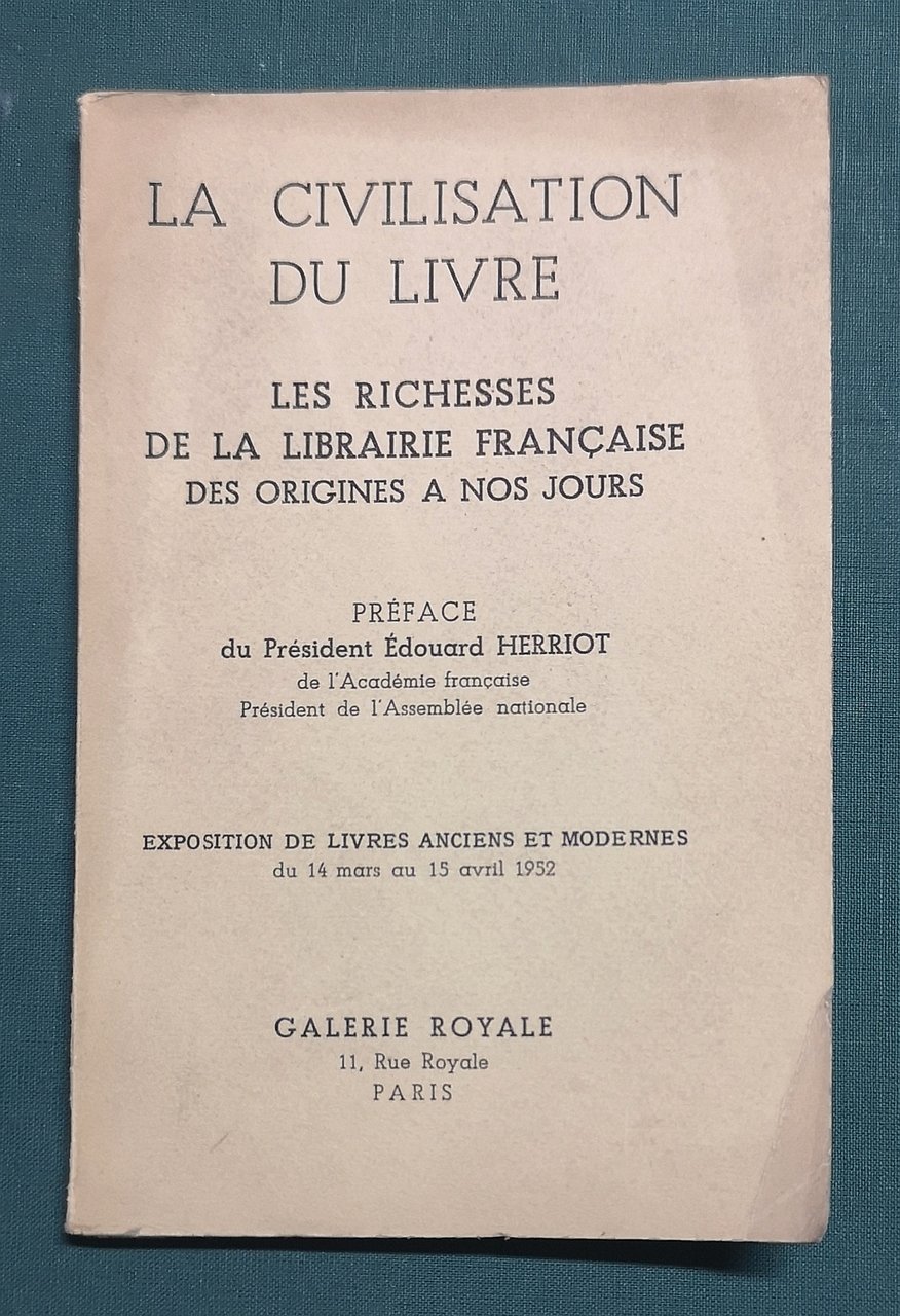 La Civilisation du livre: les richesses de la librairie française des origines à nos jours. Exposition de livres anciens et modernes du 14 mars au 15 avril 1952.