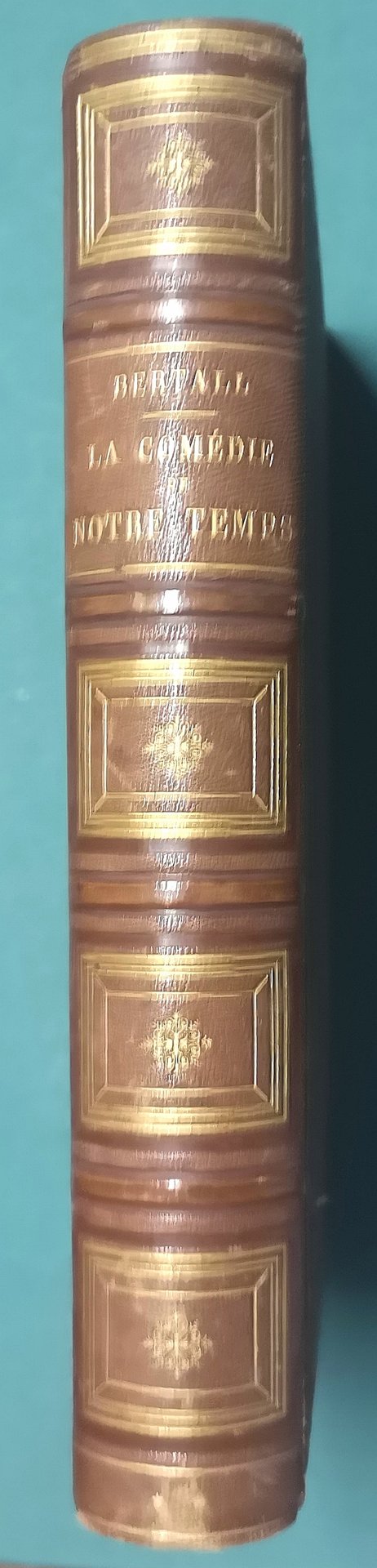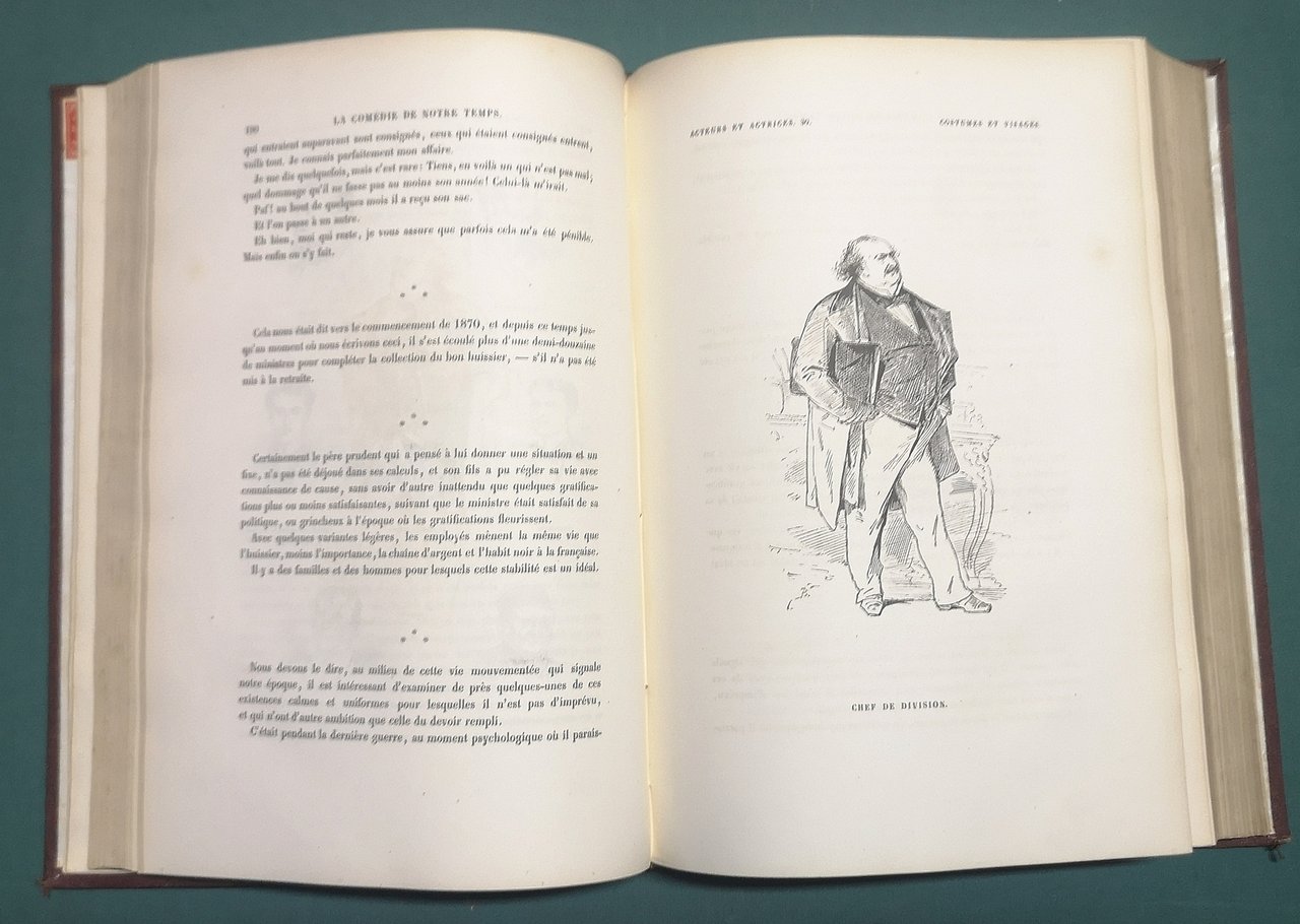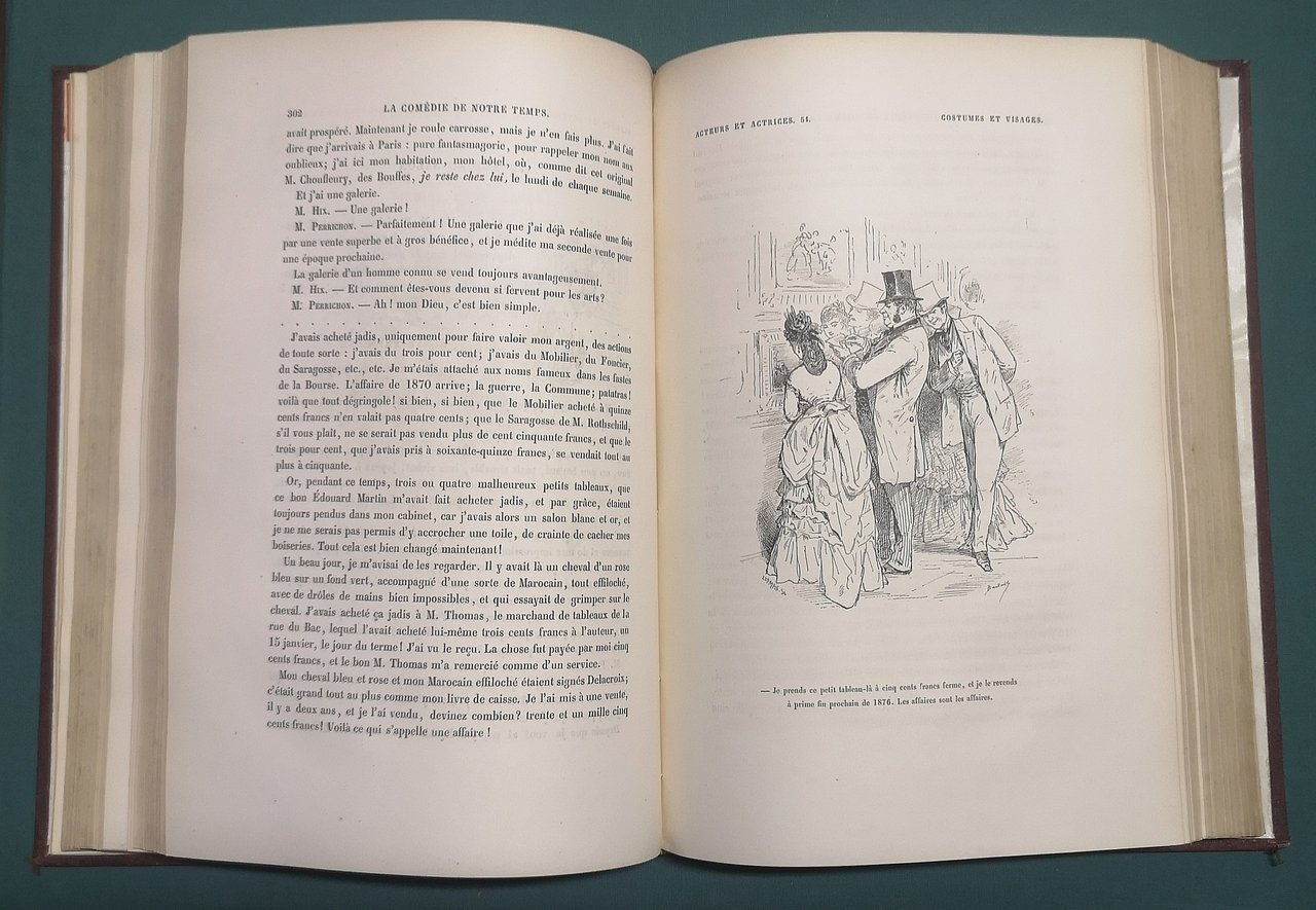 >in-4, pp. 652, antiporta figurato, centinaia di graziose vignette in nero n.t. e tavole a piena pagina; legatura in m. marocchino bruno, piatti in percallina con cornici impresse a secco, titolo e fregi geometrici in oro su dorso a nervi, tagli dorati. Seconda edizione di questo curioso ed esaustivo studio sulla moda, gli usi e i costumi dell'epoca, magnificamente illustrati dagli schizzi, spesso ironici, di Bertall. Perfetto esemplare.