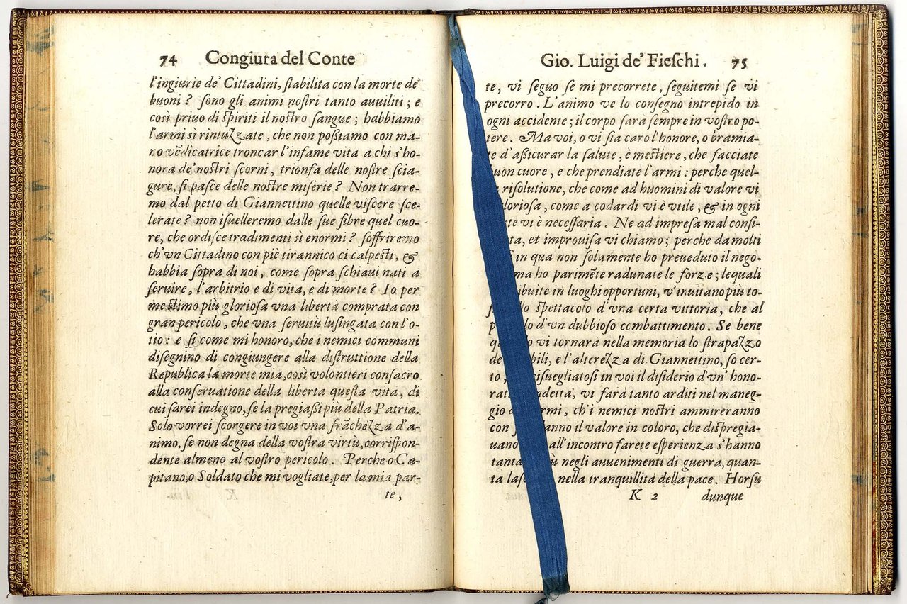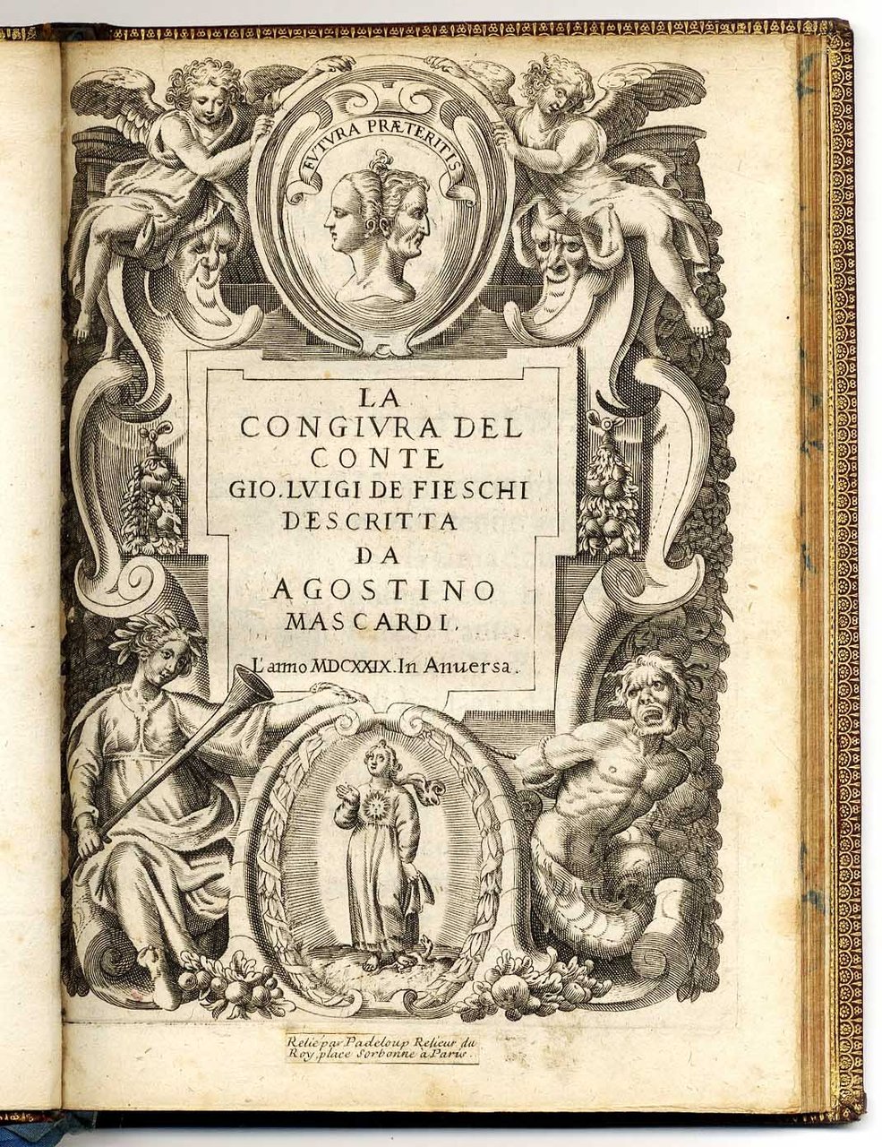 >in-4 (mm 225x165), pp. (8 compreso frontespizio inciso), 107, (1), raffinata legatura di qualche decennio posteriore in marocchino granata, triplice filettatura ai piatti, titolo e ricchi motivi vegetali al dorso, dentelle interna, il tutto impresso in oro (opera di uno dei più celebri rilegatori francesi del XVIII secolo Antoine-Michel Padeloup (1685-1758), come si evince da piccolo tassello cartaceo coevo applicato al frontespizio "Relié par Padeloup Relieur du Roy, place Sorbonne à Paris"). Bellissimo frontespizio allegorico inciso in rame. Precede il testo la dedica a Ercole Trivulzio. Edizione contemporanea all'originale veneziana e ad una milanese del Bidelli. L'autore narra la congiura ordita dal Fieschi nel 1547 ai danni di Andrea Doria: nella fasi iniziali dell'insurrezione però il Fieschi, cercando di salire su una galea dei Doria, cadde in acqua e annegò, ponendo fine alla congiura. Il Mascardi (1591-1640), nativo di Sarzana, fu cameriere d'onore di papa Urbano VIII, professore di retorica alla Sapienza e membro dell'Accademia degli Umoristi. Compose versi latini (Silvarum libri IV, 1622) e Prose vulgari (1620) di vario argomento. La sua opera maggiore è il trattato Dell'arte historica (1636), che compendia la concezione barocca di una storiografia basata sulla «ragion di stato». Magnifico esemplare di illustre provenienza (Beckford Collection), importante fonte documentaria per la storia genovese. Vinciana, 788: ''Rarissima ediz. coeva all'originale''. Brunet, III, 1514. Soprani, p. 7. Gamba, 2004 (note).