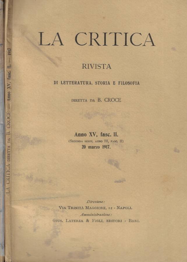 Annata incompleta in due fascicoli, II-VI rispettivamente del 20 marzo e 20 novembre 1917, della rivista di letteratura, storia e filosofia diretta da B. Croce e pubblicata il 20 di tutti i mesi dispari. Brossura in cartoncino, leggermente brunita e segnata dal tempo, al n. II con piccole macchie scure in copertina e al n. VI mancante del dorso, con scotch trasparente di sostegno. Tagli ingialliti ed irregolari; pagine anch'esse ingiallite, salde, con ampio margine e note al piede, con piccole gore sparse e testi in italiano ed alcune parti in francese. Numero complessivo pagine 130 con numerazione consecutiva.