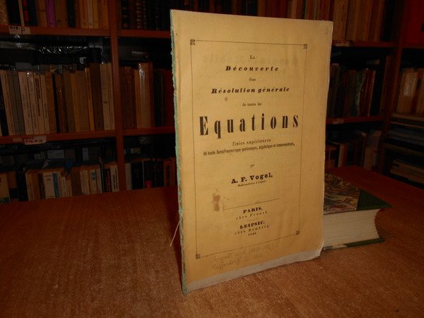 A. F. VOGEL (1817-1889). Paris, chez Franck. Leipsic, chez Romberg, 1845. La Découverte d' une Résolution générale de toutes les EQUATIONS finies supérieures de toute forme numérque quelconque, algébrique et transcendente. In-8°, br. 38 pp. Opuscolo ben conservato con strappo marginale a pag. VI. Poggendorff, II, 1220. Uff. stanzetta antic. mob. destra opusc. nonn.
