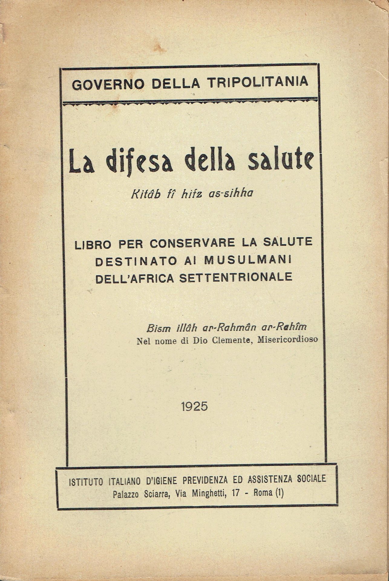 Stab.Nuove arti grafiche,1925.RARISSIMO.In testa al front.: Governo della Tripolitania ; in calce al front.. Istituto italiano d'igiene, previdenza ed assistenza sociale.Con versione in lingua araba, 68 pp. brossura Buono (Good) Ingiallimento della copertina con macchie di polvere.Strappi e abrasioni sulla parte sup. e inf. del dorso.Ingiallimento delle pagine.prime 4 pagine staccate.Perfetta leggibilità..