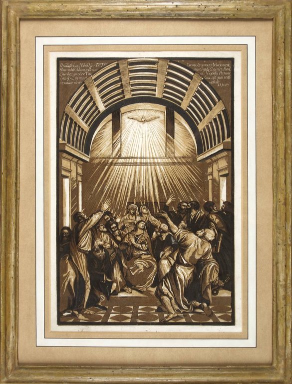>silografia da tre matrici tirate in colore giallo e bruno di varie tonalità, mm 568x382 e margini. Grandiosa scena raffigurante Cristo e gli Apostoli nel tempio, derivata da un dipinto di Tiziano. La pala d'altare eseguita per la Chiesa di S.Spirito in Isola intorno al 1550 si trova ora a S. Maria della Salute. Legenda firmata, con dedica al nobile J.S. Makinzie, nell'alto della composizione. Il Jackson, innovatore nel 18^ secolo dell'incisione a chiaroscuro, produsse a Venezia, sotto il patrocinio del Console Smith, una serie di 24 stupende silografie eseguite con la medesima tecnica del chiaroscuro da tre o quattro matrici che venne edita dal Pasquali nel 1745. Rara e assai decorativa.