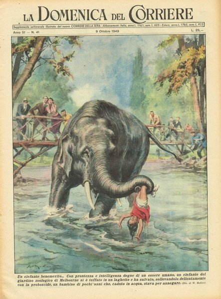 Fascicolo settimanale suppl.to del Corriere della Sera, 9 ott.1949, copertina editoriale illustrata con disegni a colori di W.Molino, ingiallita lungo i margini e con lieve fioritura, ulteriore copertina di colore celeste, ingiallita e con minuta fioritura, pagine ingiallite, con bruniture ai bordi, sottile fioritura, illustrazioni nei testi e strappetti ai bordi della 9 e 11. Numero pagine 15
