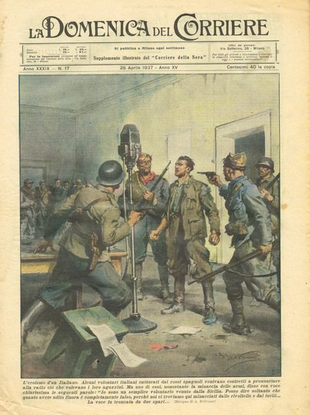 Fascicolo settimanale suppl.to del Corriere della Sera, 25 apr.1937-XV, copertina editoriale illustrata con disegni a colori di A.Beltrame, ingiallita, con fioritura e traccia di vecchia umidità, ulteriore copertina celeste, ingiallita, con traccia di umidità e fioritura, ruggine alla spillatura, pagine ingiallite, con sporadica fioritura, strappetti ai bordi e traccia di vecchia umidità. Numero pagine 15