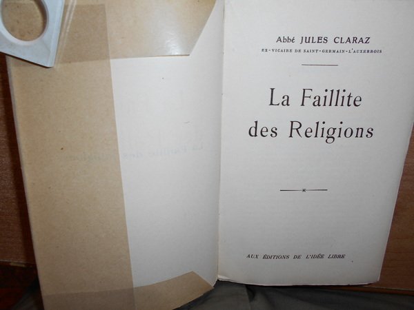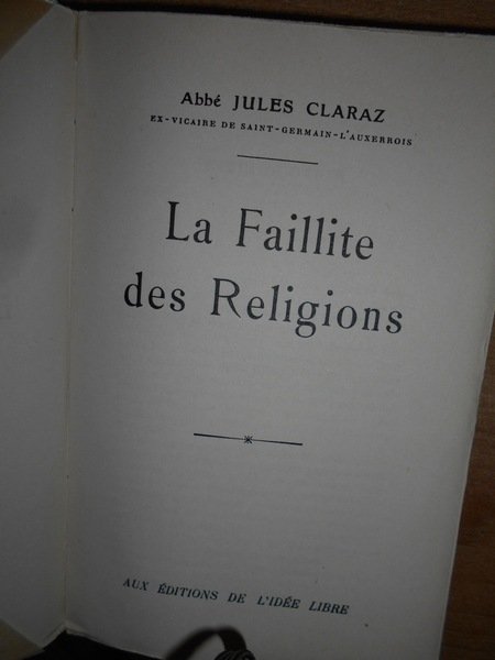 Abbé Jules Claraz. Herblay, aux éditions de L' Idée Libre, senza data (1930). La Faillite des Religions. Nouvelle édition. In-16°, br. orig. con velina trasparente di protezione. 391 pp. Ben conservato. Neg. mens. bianca cassa
