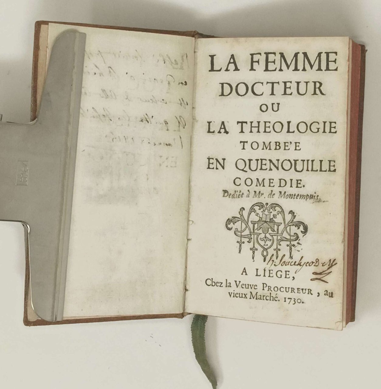 >2 opere in un vol. in-12, pp. (18), 162, (2 bianche); (2), 124. Leg. del tempo p. pelle, dorso a nervi con tit. oro, tagli rossi. Prima edizione di entrambe le commedie, in cinque atti in prosa, composte dal letterato e storico gesuita francese (1690-1741) nel clima delle dispute tra Molinisti e Giansenisti, molto vivaci e sentite nella società francese dell'epoca. Presto divennero celebri e furono tradotte in italiano e spagnolo e nel 1732 l'autore con ''Arlequin Janséniste, ou Critique de la Femme docteur'' completò la trilogia. ''Comédie célèbre qui a rapport aux querelles des molinistes et des jansénistes. L'auteur, qui était jésuite, a représenté un janséniste sous les couleurs du Tartuffe de Molière...Cette Critique-là est une apologie très-caressante de la pièce et des molinistes, une satire très-vive contre les jansénistes, leurs écrits et leurs miracles'' (Soleinne). Antica firma di possesso al frontespizio. Ottimo esempl. Soleinne 3770 e 3773. De Backer-Sommervogel I, 1876 n. 9 e 10.