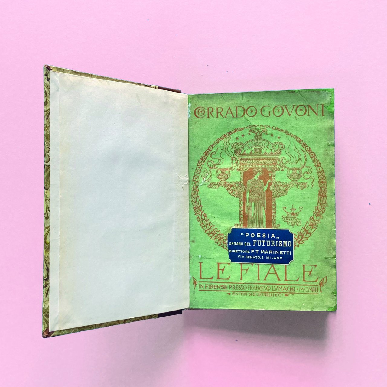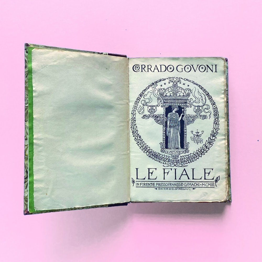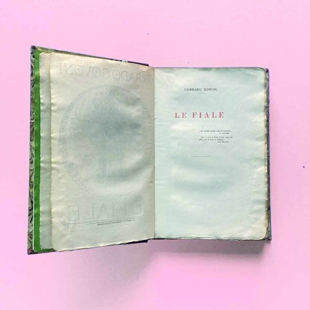 4°, pp. (4), 224, brossura con xilografia a due colori di Adolfo de Carolis conservata entro elegante mezza pelle d'amatore. Cartiglio al piatto: Poesia – Organo del Futurismo. Contiene 11 xilografie di De Carolis. Volume stampato a spese dell'autore. La quasi totalità della tiratura fu messa in commercio, nel 1909 con la suddetta etichetta. Una sigla a penna all'angolo della prima carta bianca. Esemplare a pieni margini, ottimo stato conservativo.