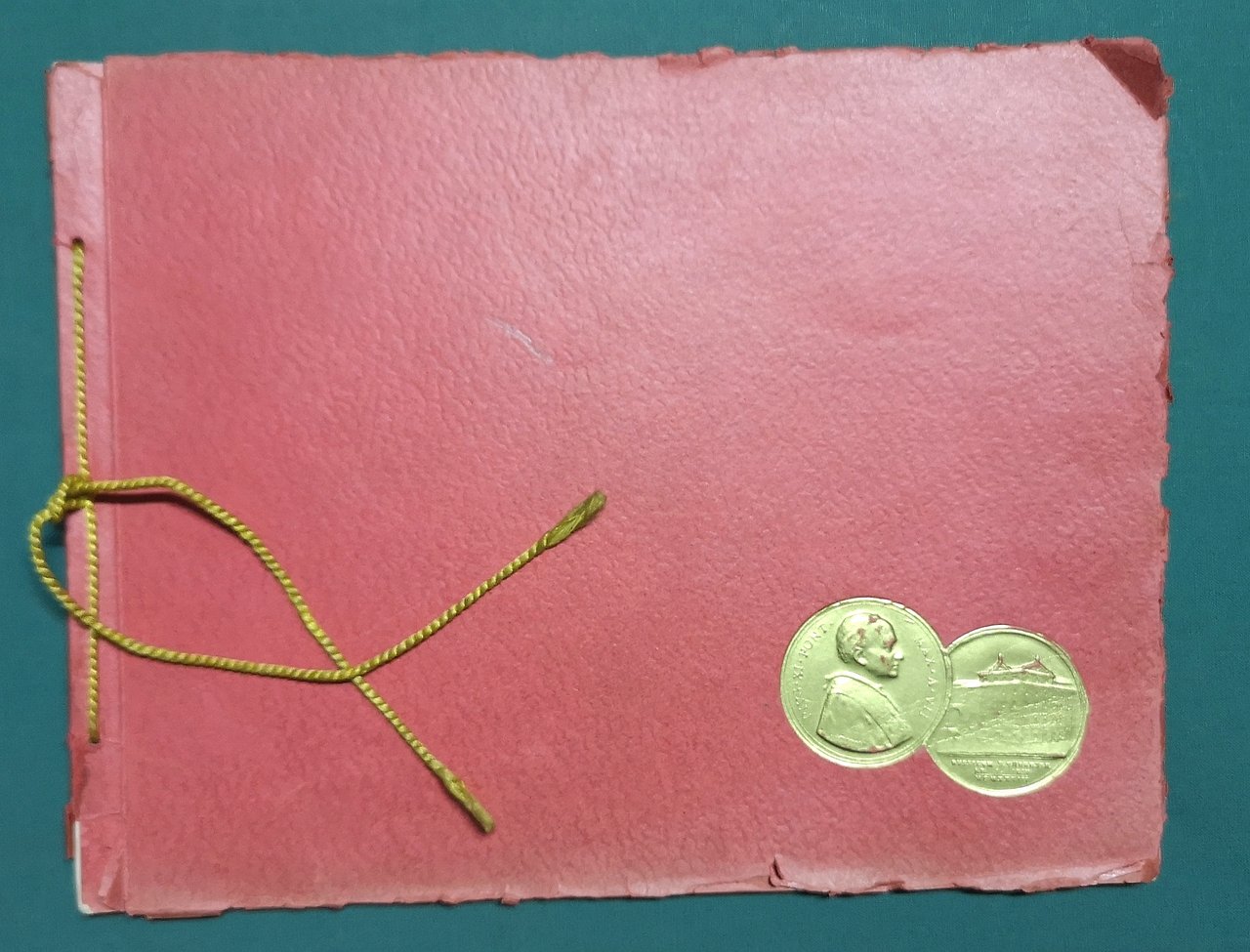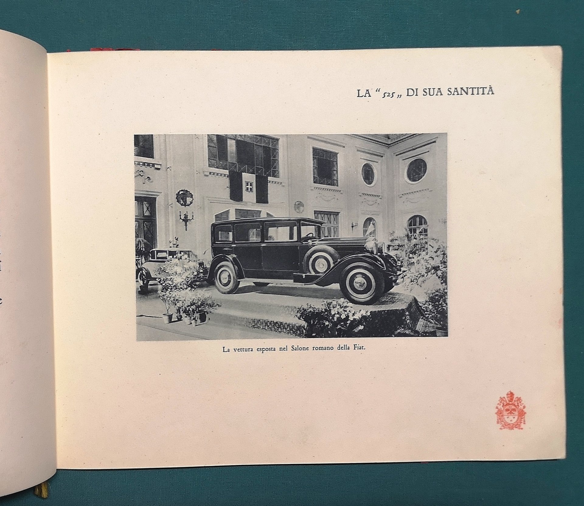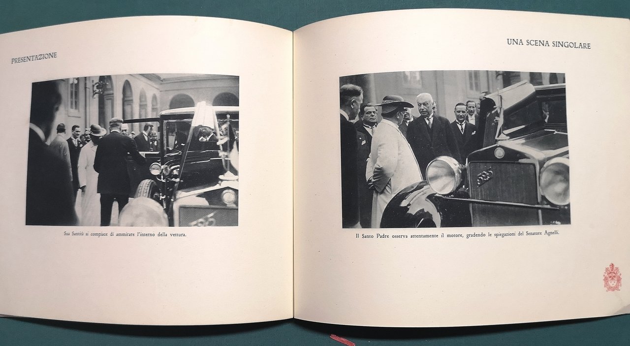 >in-8 oblungo, pp. (28) di cui 4 di introduzione e 22 di tavole fotografiche in nero; legatura in cart. rosso ornato al piatto ant. da due medaglie dorate in rilievo (effige di Pio XI e edificio del Russicum Theresianum), cordoncino in oro passante al dorso. Pregevole edizione, non comune, impressa su carta forte con timbro vaticano in rosso al margine inferiore di ciascun foglio, che commemora la consegna della Fiat 525 a Papa Pio XI da parte del senatore Agnelli. La prima "Papa mobile", guidata per l'occasione dal celebre pilota automobilistico Felice Nazzaro. Buon esemplare.