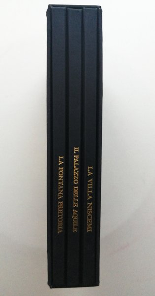cofanetto in cartone telato con immagine impressa in oro formato 22X15 contenente 3 volumi stesso formato in legatura tutta seta con immagine a colori applicata a mano e testi in oro in impressione pagine 79+79+79. Fontana Pretoria con molte immagini in B/N. Il Palazzo delle Aquile con immagini a colori e in B/N. La Villa Niscemi con molte immagini a colori e in B/N. Bella copia come nuova