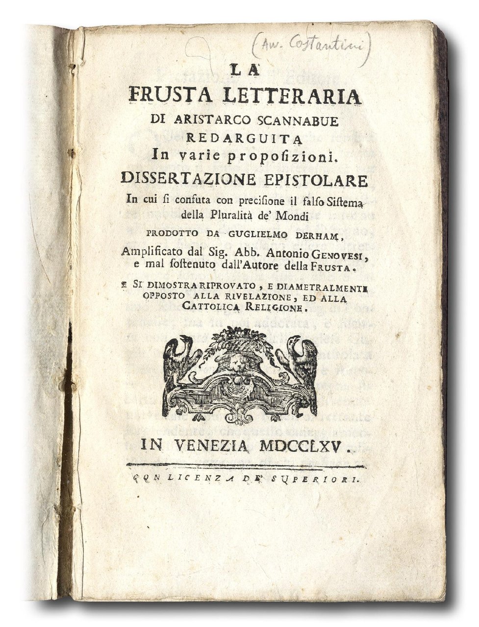La Frusta Letteraria di Aristarco Scannabue redarguita in varie proposizioni. Dissertazione epistolare in cui si confuta con precisione il falso sistema della pluralità de' mondi prodotto da Guglielmo Derham, amplificato dall'Abb. Antonio Genovesi e mal sostenuto dall'autore della Frusta...