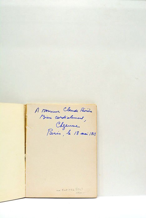 90 pages. (17x13cm.). Broché. Couverture imprimée. Quelques salissures aux plats. Dos partiellement décollé. Coins et coiffes légèrement émoussés. Intérieur en bon état. Dédicace signée et datée de l'auteur à l'anthropologue Claude Rivière. Lejeune s'exprime une pensée qui se dit athéologique où on trouve des accents mystiques. Couverture dessinée par G. Bertini.