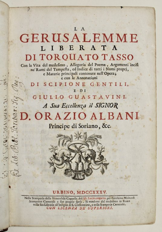 La Gerusalemme liberata di Torquato Tasso con la vita del medesimo, allegoria del poema, argomenti incisi ne' rami del Tempesta, ed Indice di tutti i nomi propri, e materie principali contenute nell'opera; e con le annotazioni di Scipione Gentili