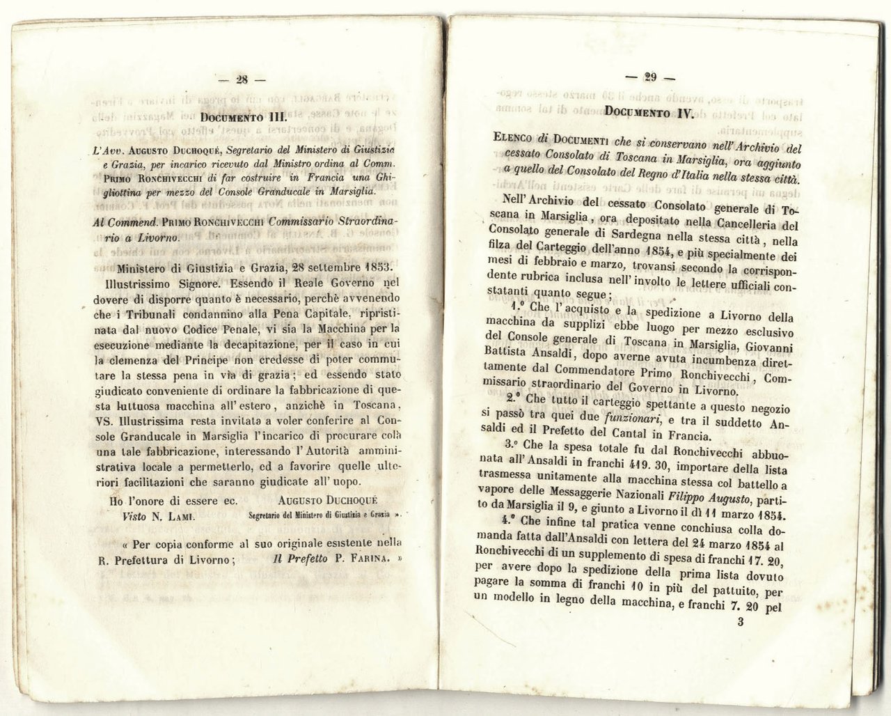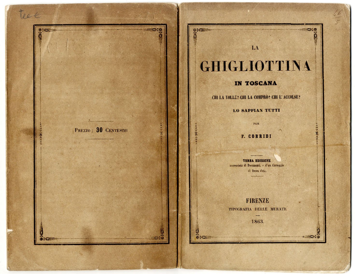 >in-16, pp. 78, broch. edit. (piccola mancanza al piatto ant.). Terza edizione ampliata e definitiva di opera curiosa e decisamente non comune. Filippo Corridi (Livorno 1806 - 1877) fu brillante matematico e autore di trattati di calcolo, geometria e trigonometria, precettore dei figli del Granduca Leopoldo II di Toscana e, a partire dal 1850, direttore delle Scuole Tecniche delle Arti e delle Manifatture su nomina del Granduca. In quest'opera l'A. si difende strenuamente dall'accusa di essere stato fautore dell'introduzione della ghigliottina in Toscana, discolpandosi attraverso la narrazione dei fatti, corredata dalle pubblicazione di documenti e note ufficiali. Nel codice criminale del Governo Toscano, si ripristinava, il 20 giugno 1853, la pena capitale. La ghigliottina, che era stata fatta giungere a Firenze dalla Francia in gran segreto, era stata imballata in casse con dicitura ''strumenti idraulici''. Tale particolare spinse diversi periodici piemontesi ad attribuire al Prof. Corridi la perorazione, l'acquisto e il montaggio dello strumento di morte. A fronte di tali calunniose asserzioni i Ministri toscani tacquero e l'A. avviò una sua propria indagine che ricostruisse la vicenda, grazie alla cui pubblicazione riuscì infine dimostrare la propria estraneità ai fatti ed a riabilitare il proprio buon nome. Buon esemplare, assai fresco.