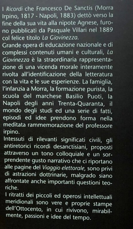 I Ricordi, che Francesco De Sanctis (1817-1883) dettò verso la fine della sua vita alla nipote Agnese, furono pubblicati da Pasquale Villari nel 1889 col felice titolo "La Giovinezza". Grande opera di educazione nazionale e di complessi contenuti umani e culturali, "La Giovinezza" è la straordinaria rappresentazione di una vicenda morale interamente rivolta all'identificazione della letteratura con la vita e le sue esperienze. La famiglia, l’infanzia a Morra, la formazione purista, la scuola del marchese Basilio Puoti, la Napoli degli anni Trenta-Quaranta, il mondo degli studi e una serie di fatti, episodi e idee prendono forma nella meditata rammemorazione del professore irpino. Intessuti di rilevanti significati civili, gli antiretorici ricordi desanctisiani, proposti attraverso un tono colloquiale e un sorprendente gusto narrativo che ci riportano alle pagine del "Viaggio elettorale", sono privi di astrazioni dottrinarie, malgrado siano affrontate anche importanti questioni teoriche. I ritratti dei piccoli e operosi intellettuali meridionali sono vere e proprie stampe dell’Ottocento, in cui rivivono, mirabilmente, passioni e idee del tempo. L'opera è l'inizio di una autobiografia che rimase incompiuta e che, elle intenzioni di Francesco De Sanctis, avrebbe dovuto intitolarsi "Ricordi"oppure "Memorie". Il titolo "La giovinezza: frammento autobiografico" le fu attribuito da Pasquale Villari, il primo curatore, il quale aveva ricevuto i quaderni originali dalla vedova di Francesco De Sanctis. I quaderni originali andarono perduti. Tuttavia l'autografo di Agnese De Sanctis con i primi dieci capitoli fu ritrovato nel 1958 da Gennaro Savarese il quale poté eliminare le varianti introdotte dal Villari e preparare un'edizione critica per l'editore Einaudi.