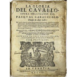 La gloria del cavallo, divisa in dieci libri: ne quali, oltrev gli ordini appartenenti alla Cavalleria, si descrivono tutti i particolari, che sono necessari nell'allevare, custodire, maneggiare, & curar cavalli. Di nuovo ricorretta, e ristampata et in quest'ultima edizione aggiuntovi le postille, e tre libri di Gio. Antonio Cito ne' quali si tratta delle infermità, che avvengono al Cavallo, et al Bue, co' rimedi di esse. UNITO A: Del conoscere le infermità che avvengono al cavallo et al bue co' rimedij a ciascheduna di esse. Libri tre. pp. (6) + 136
