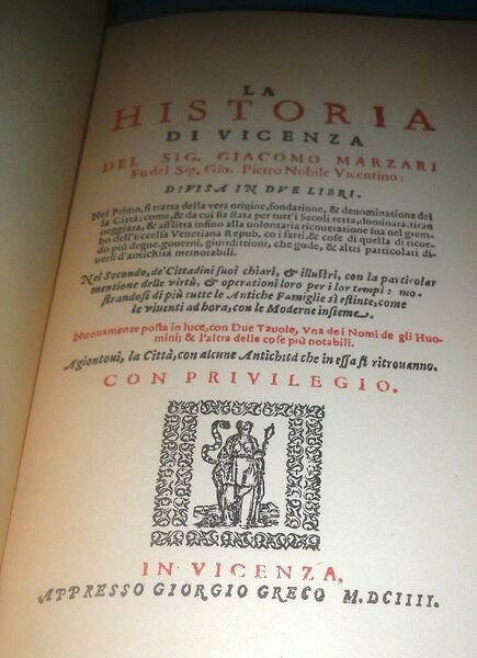 MARZARI, la historia di Vicenza - Forni ed. 1973 - ristampa fotomeccanica del libro pubblicato nel 1604 - copertina morbida, pag. 214 cui precedono indici e tavole, formato cm. 18 x 26 - volume in buono stato, minimi segni, ingiallimento pagine