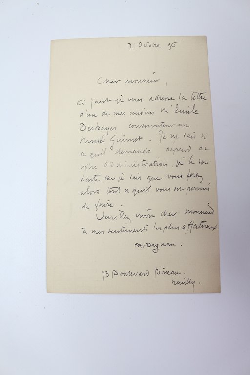 La lettre d'un de mes cousins conservateur au musée Guimet • Lettre autographe signée au peintre Lucien Hector Monod