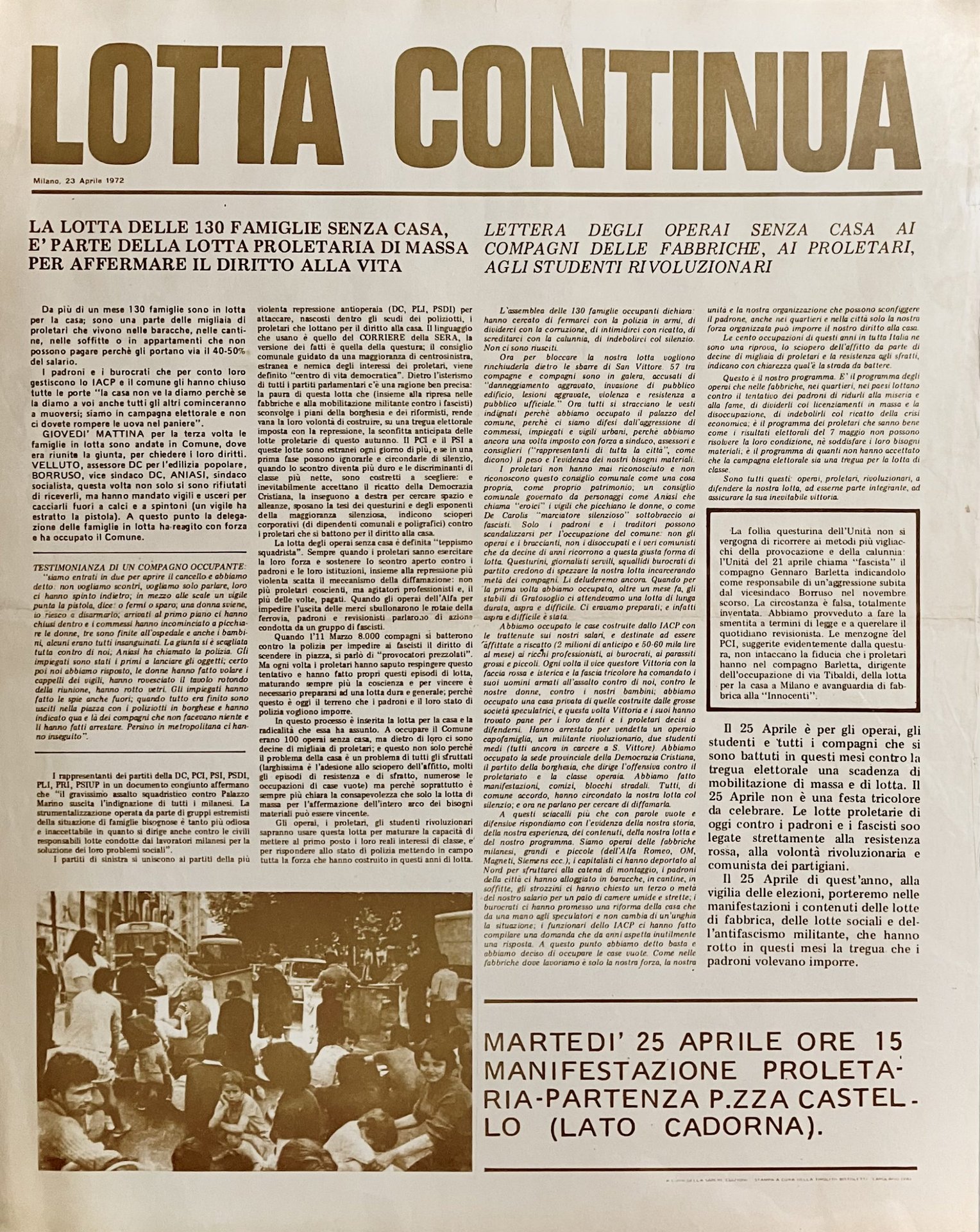 Volantone stampato al solo recto, per la lotta di 130 famiglie senza casa che hanno occupato il Comune di Milano, con una lettera-appello degli operai senza casa. In ottimo stato.