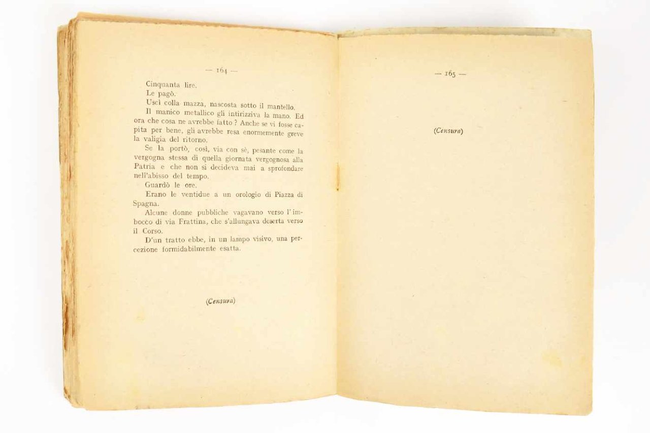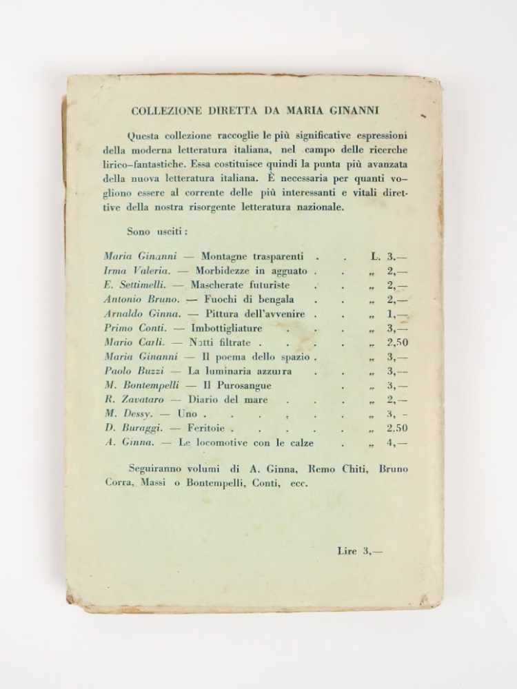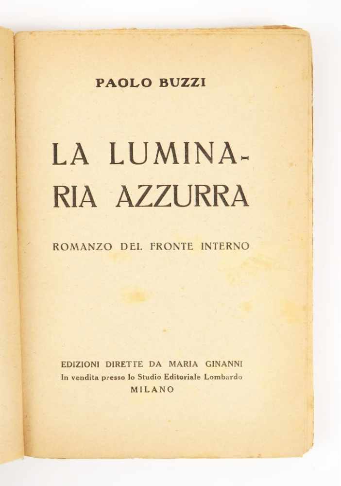 LIBROEdizione originale, seconda emissione.Più che buon esemplare, quasi ottimo (copertina lievemente scolorita e con poche e lievi fioriture; normale uniforme brunitura alle pagine interne; per il resto pulito).Rara seconda emissione ottenuta tramite ricopertinatura delle rese dell’emissione targata Studio Editoriale Lombardo. La nuova emissione aggiunge un foglio di avvertenze che spiega i tagli della censura e rivendica orgogliosamente il primato dell’arte («alto senso di purezza verista») su «qualche cautela d’ordine moralista». Il romanzo d’avanguardia con inserti paroliberi («poema civile» nelle parole del l’autore), scritto nel 1916 e in pubblicazione nel 1918, venne fermato e l’uscita ritardata al 1919 per l’intervento del censore — i cui tagli sono lasciati provocatoriamente in bianco nel testo. -- Dedicatoria ad Armando Mazza: «Mia prima idea fu quella di fermare in un libro di pura sintesi alcuni scorsi scenici oltre parecchi stati d’animo determinati dalla guerra, nel 1916, in Milano, la città della guerra magnificamente sonora e responsabile. [.] È un tentativo di romanzo, indubbiamente futurista, cioè antivigliacco ed antigrazioso certo necessario del “fronte interno” [.]».Cammarota, Futurismo, 68.9