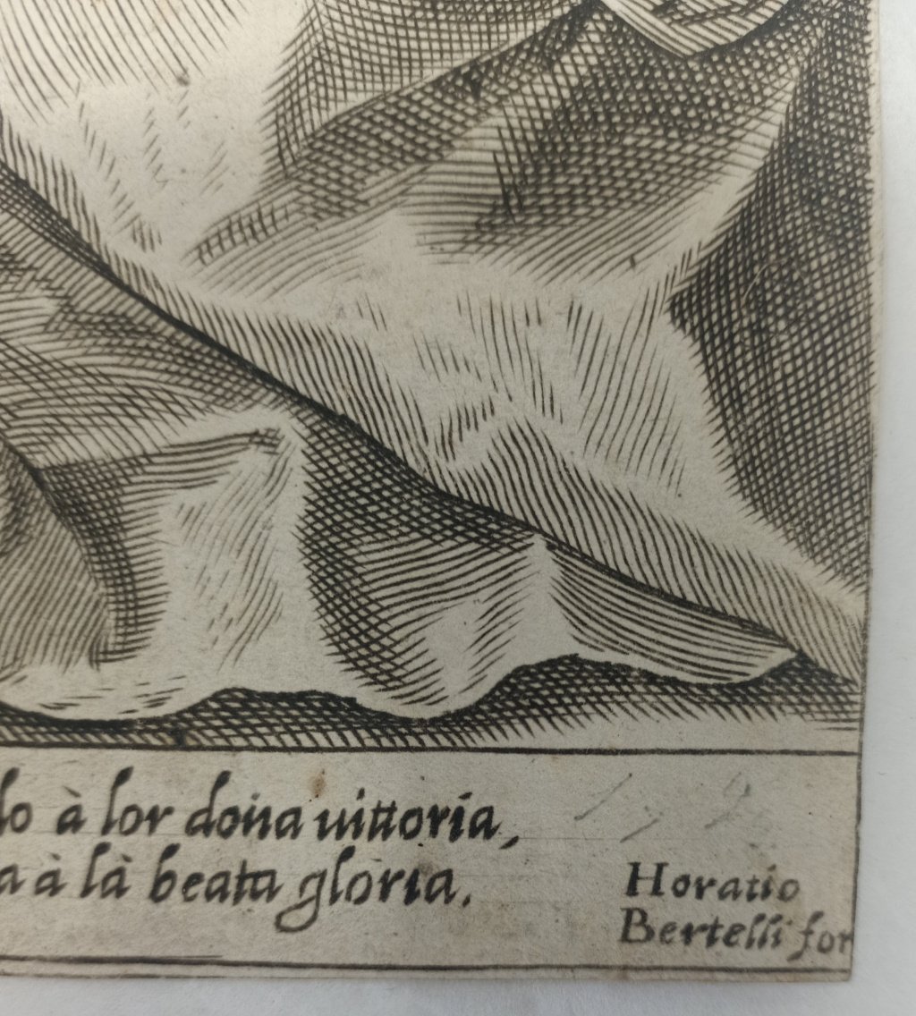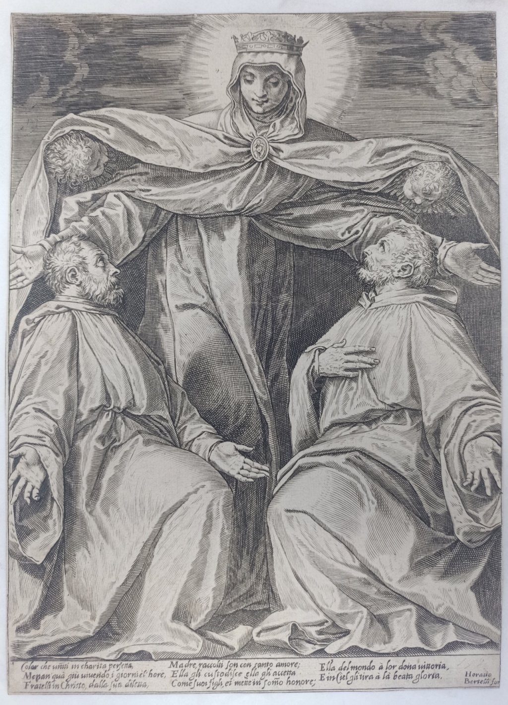 >Bulino, mm. 320x216. Esemplare del terzo stato di tre, recante l'indirizzo dell'editore Orazio Bertelli ed i versi su tre colonne, lungo il margine inferiore: "Cholor che uniti in charita perfetta/Menan qua giu vivendo. I giorni "el" hore/Fratelli in Christo, dalla sua diletta,/Madre, raccolti son con tanto amore...'' (secondo il Malvasia i versi furono composti dallo stesso A. Carracci. L'incisione deriva da un dipinto di Paolo Veronese, andato perduto, delle medesime dimensioni della lastra. Lo stile dell'opera e la sua affinità con quelle del periodo veneziano, dimostrano che fu eseguita da Agostino nel 1582, come conferma l'indicazione dell'editore Bertelli, attivo a Venezia. Bell'esemplare databile nell'ultimo quarto del XVI secolo, corto di margini, in buono stato di conservazione. Bartsch 102 S3.