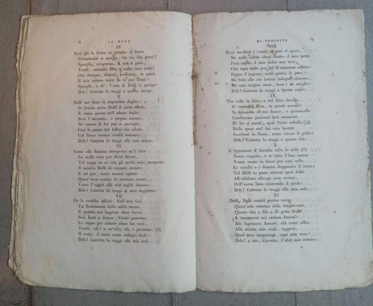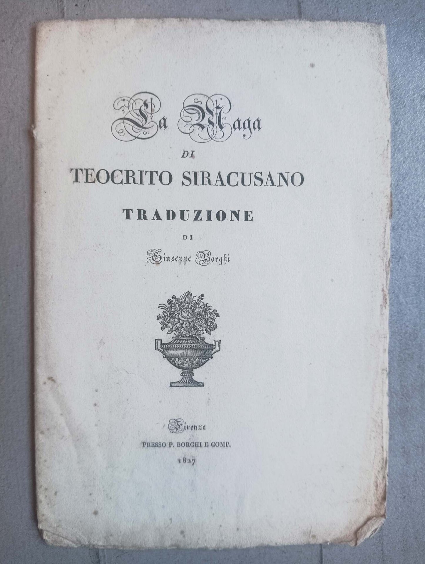 >in-8 (mm 232x153), pp. 16, opuscolo, brossura editoriale coeva; titolo, autore e indicazioni tipografiche al piatto superiore. Idillio di Teocrito, inventore della poesia bucolica, tradotto dal greco dal Borghi. Buono stato, piccole fioriture rosse diffuse.