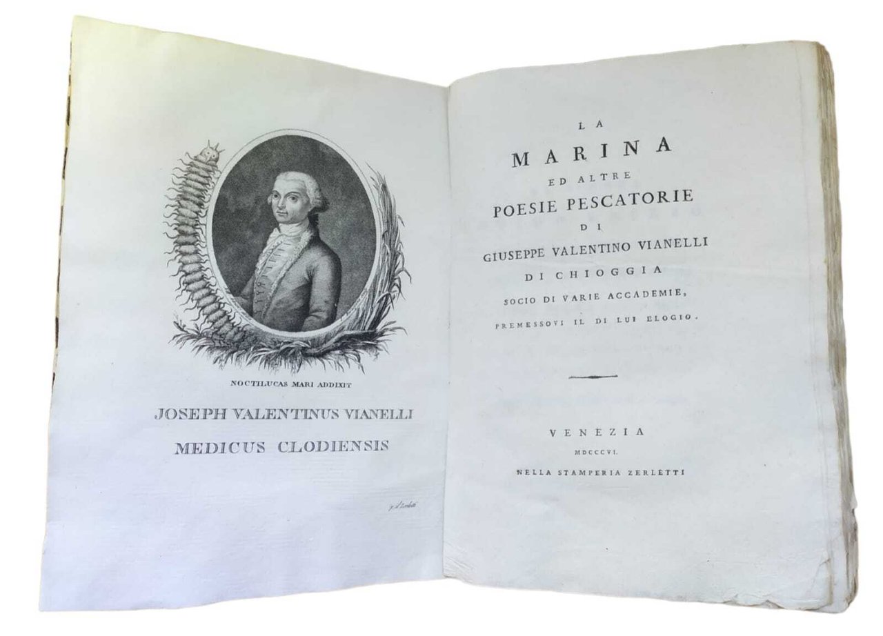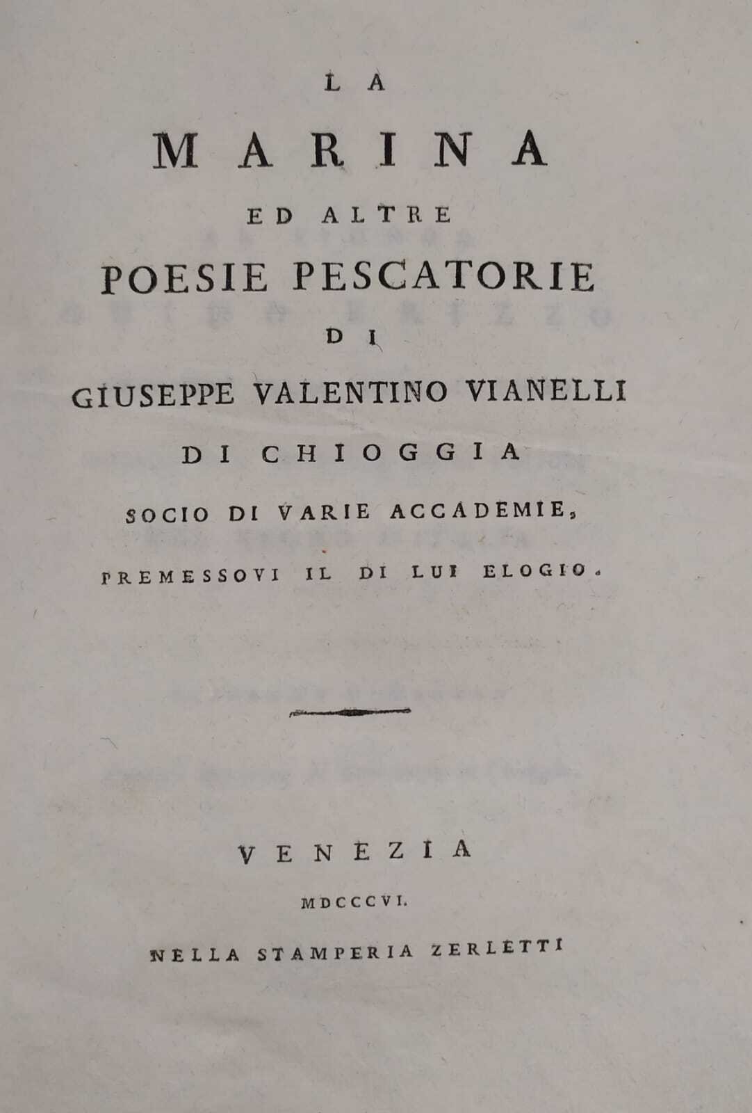 Raccolta di poesie pescatorie, sacre, giocose del medico, naturalista e letterato Giuseppe Valentino Vianèlli. Ritratto dell'autore in litografia antiporta. in ottavo leg. bross., titolo e su tassello al dorso pp. (8), 207, (3) Buono (Good) Buon es..