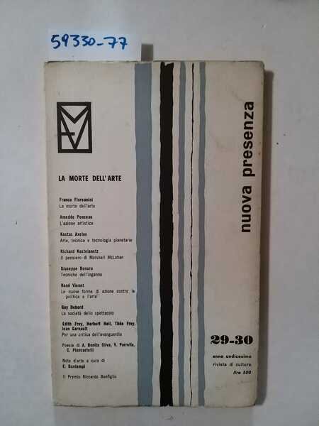 (Collana : Nuova presenza - n. 29-30) Raccolta di saggi che dimostrano il passaggio da una concezione passiva e contemplativa dell'arte ad una attiva e critica, come frutto delle trasformazioni politico-economico-sociali - DETTAGLIO DELLE CONDIZIONI : Coperta e pagine lievemente ingiallite - (1.VIII.7).