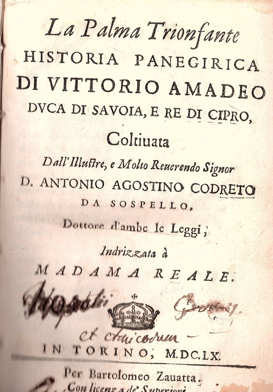 La Palma Trionfante Historia Panegirica di Vittorio Amadeo ,e re di Cipro, coltivata dall'illustre, e molto reverendo signor d. Antonio Agostino Codreto da Sospello, dottore d'ambe le leggi, indrizzata à madama Reale CONTIENE ANCHE Il giacinto che trà fiori del real giardino di Savoia, spande odorosa fragranza [.]