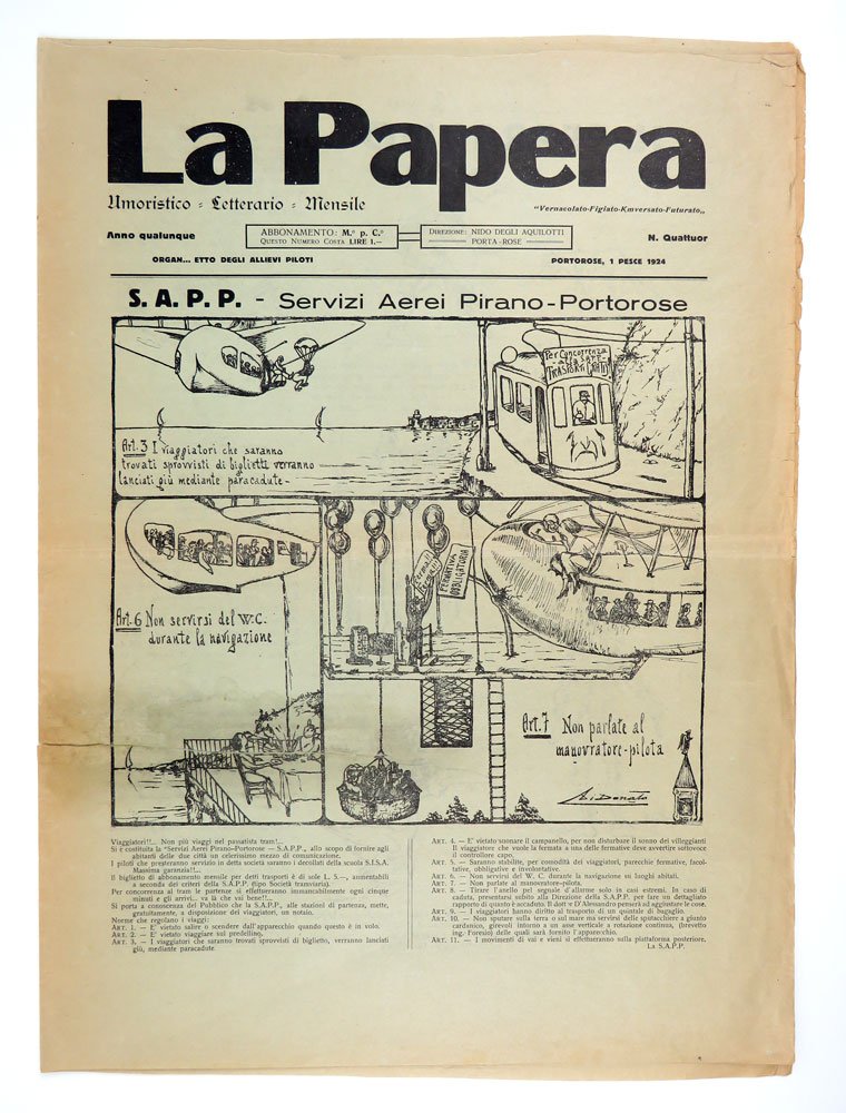 PERIODICOEdizione originale.Due lacerazioni riparate, senza perdite; per il resto ottimo esemplare di questo fragilissimo reperto.Rarissimo foglio satirico/umoristico prodotto a Portorose, nota località balneare istriana oggi territorio sloveno con il doppio nome di Portoroz. Gerente responsabile un non meglio noto Giorgio Fonda. In questo numero una parodia futurista a pagina 7: «Impressione futurista di una dichiarazione d’amore volativa [sic]», una parodia del teatro sintetico futurista con ricorso agli stilemi paroliberi, firmata «Gibbi Avoeg». Una sola localizzazione ICCU, alla Biblioteca di Storia dell’università di Roma, che apparentemente possiede proprio questo fascicolo («1 marzo 1924»).