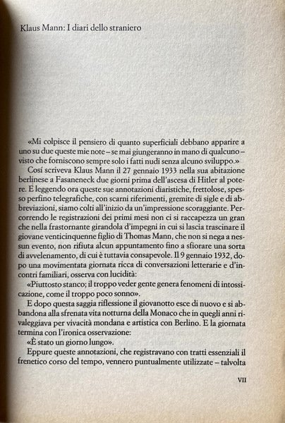 I diari di Klaus Mann costituiscono una delle testimonianze più lucide e toccanti di un periodo tragico della storia europea: quello che vede la fine della Repubblica di Weimar e l'avvento al potere del nazismo. Lo sforzo e il bisogno di capire si alternano con la disperazione dell'esiliato e la solitudine del "diverso" in pagine ricche di notizie, incontri, ritratti, intuizioni, analisi. Condotta sull'edizione critica tedesca e riccamente annotata, questa traduzione mette finalmente a disposizione del pubblico italiano un documento storico prezioso e una lettura di straordinario fascino.