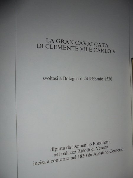 Gancarlo, Roversi. "Aniballi Edizioni 1984, edizione della Banca Popolare di Bologna e Ferrara. In-4° piccolo, rilegato con copertina rigida telata e sovraccoperta illustrata, numerose ill. in B/N e a colori, 245, (1) pp. Allegato "La gran cavalcata di Clemente VII e Carlo V svoltasi a Bologna il 24 febbraio 1539 dipinta da Domenico Brusasorci nel Palazzo Ridolfi di verona incisa a contorno nel 1830 da Agostino Comerio. Presentazione di Eugenio Riccomini, prologo di Gina Fasoli. In ottimo stato di conservazione o come nuovo" Neg. Bol. mob. B