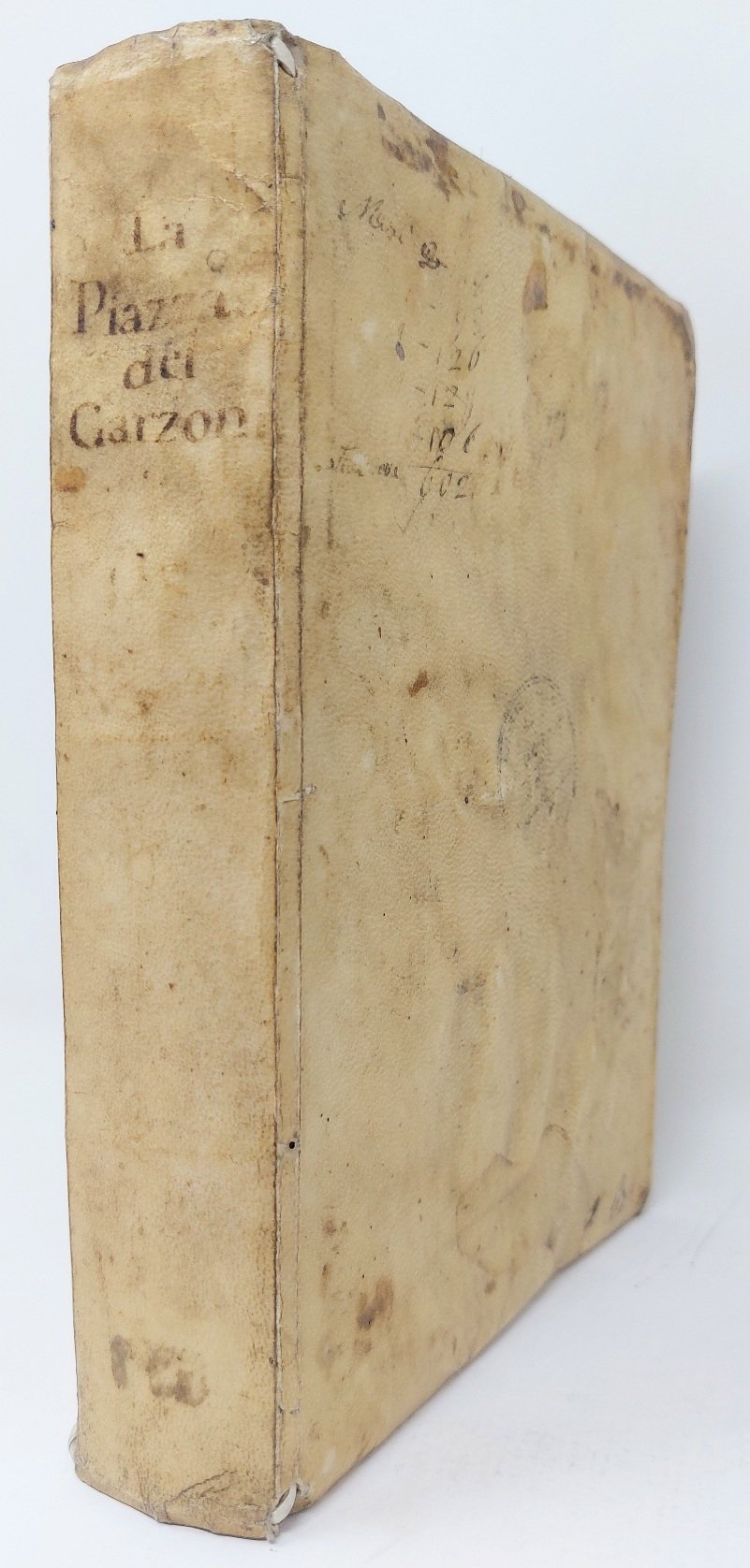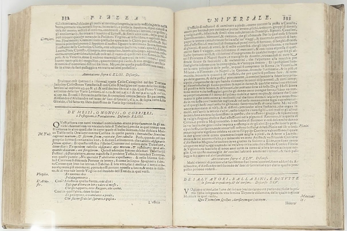 >in-4, pp. (16), 684, leg. coeva in pergamena, titolo ms. al dorso. Impresa tipogr. al tit., fregi ed iniz. silogr. Pregevole edizione, molto accresciuta rispetto alla prima del 1585, di quest'opera enciclopedica, interessante e curiosa che ebbe enorme successo, fu sovente ristampata e tradotta in latino e tedesco. Divisa in 155 Discorsi, essa fornisce una quantità di notizie utili alla storia delle scienze, delle invenzioni, delle professioni e mestieri umani. Per quanto attiene al teatro si vedano i seguenti argomenti trattati: ''De saltatori, ballarini...'' (Discorso XLI, pp. 333-338); ''De' comici, et tragedi, così auttori, come recitatori, cioè de gli histrioni'' (CIV, pp. 544-547); ''De' formatori di spettacoli in genere...'' (CV, pp. 548-553); ''Buffoni, o mimi, histrioni'' (CXIX, pp. 598-600). Buon esemplare (abili restauri marginali al frontesp., tre timbri di biblioteca privata nei primi due ff.). Cat. Rasi p. 379 e Gamba 1415 (entrambi ediz. 1595). Choix d'Olschki VI, 6698.