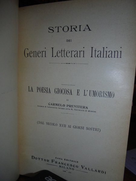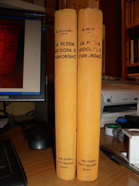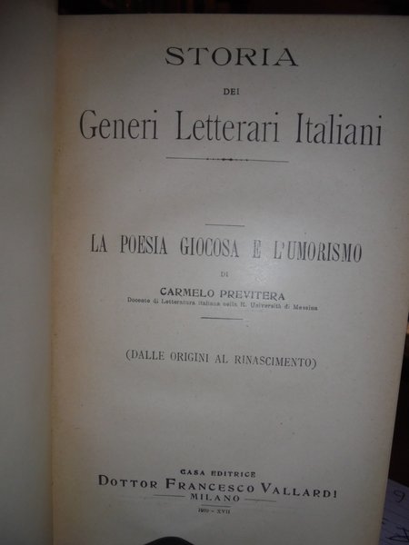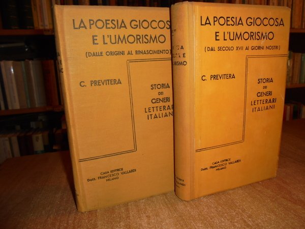 PREVITERA,CARMELO. Milano, Francesco Vallardi, 1939 - 1942. LA POESIA GIOCOSA E L'UMORISMO. VOL. I: DALLE ORIGINI AL RINASCIMENTO. VOL. II: DAL SECOLO XVII AI GIORNI NOSTRI. 2 volumi in-8°, legatura edit. in tela/m.tela. x, 434 pp.; iv, 505 pp. Ben conservati. Uff. A - II - 2