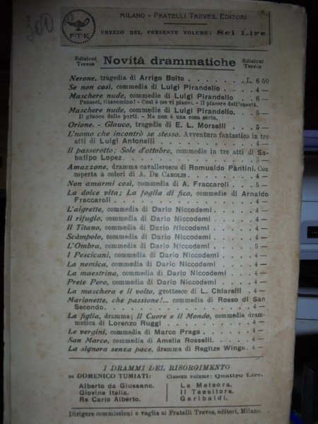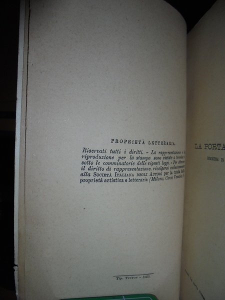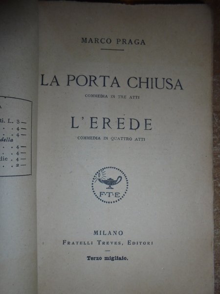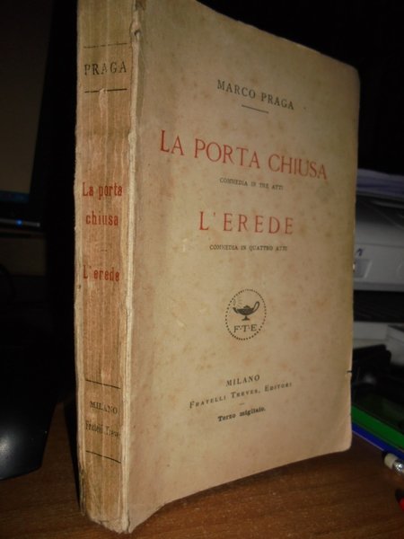 Marco, Praga. Milano, Fratelli Treves, Editori, 1920. La porta chiusa commedia in tre atti. L' erede commedia in quattro atti. In-16°, br. orig. 300, (15) pp. di Biblioteca Teatrale Italiana e Straniera, Agosto 1919. Esemplare ben conservato. Neg. mob. nero 9