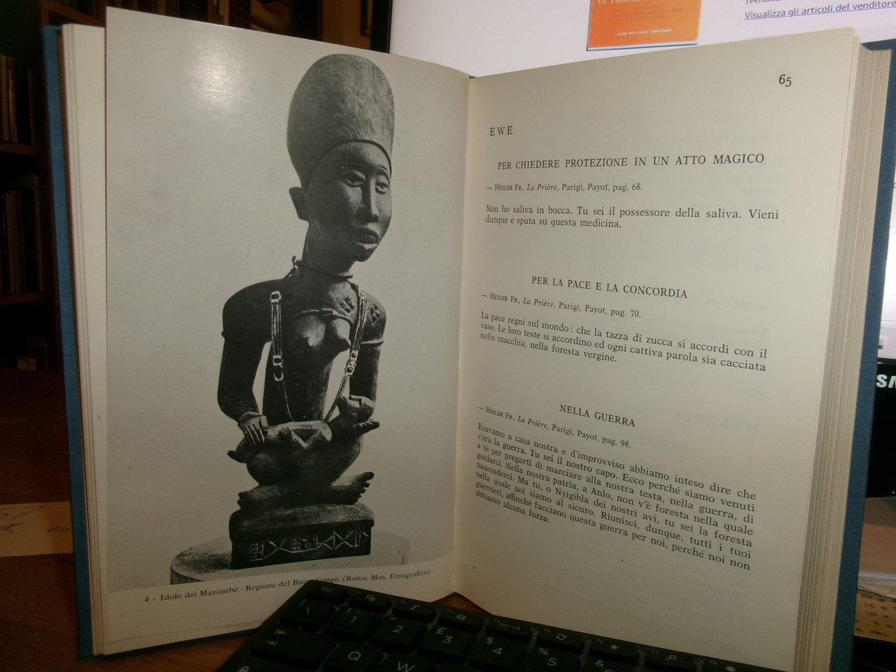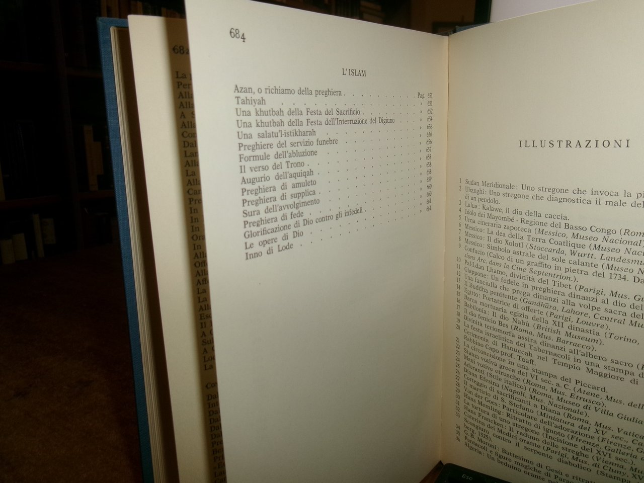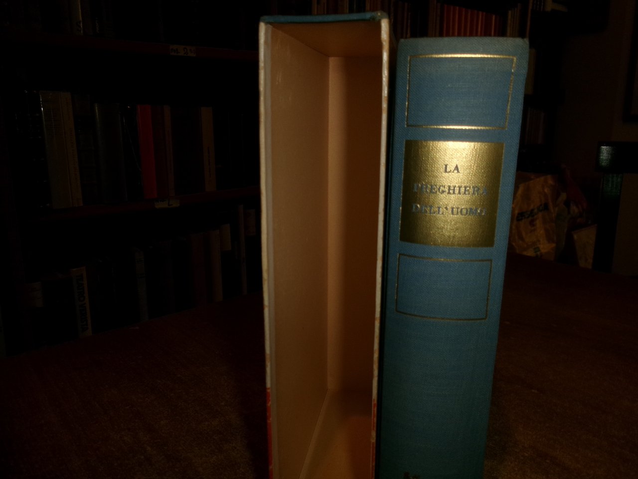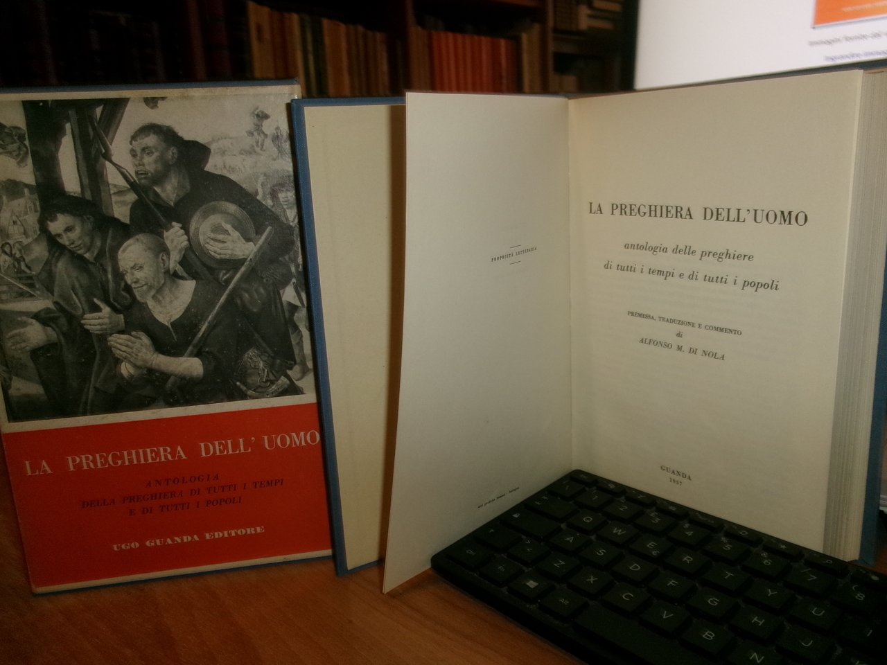 LA PREGHIERA DELL' UOMO antologia delle preghiere di tutti i tempi e di tutti i popoli. Premessa, traduzione e commento di ALFONSO M. DI NOLA. Parma, Ugo Guanda Editore, 1957. In-8°, tela edit. con fugura in oro e rosso sul piano anteriore, titolo in oro sul dorso. 685 pp. con numerose tavole in bianco e nero f.t. In ottimo stato con astuccio in cartonato illustrato. Neg. esot. mob. 13