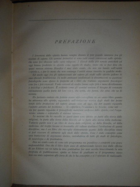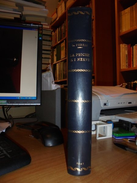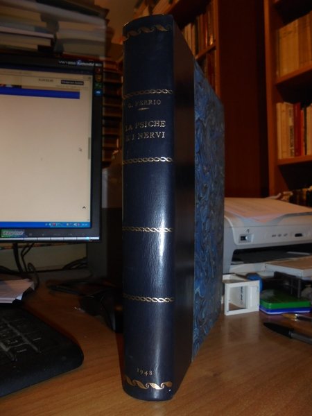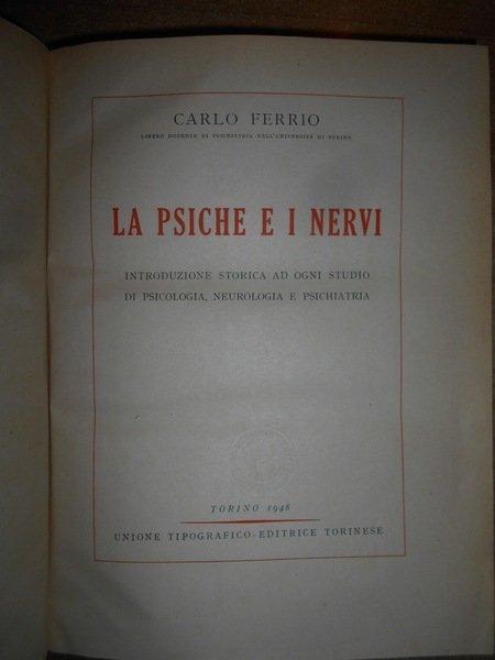 Carlo, Ferrio. Torino, U.T.E.T. Editrice, 1948. La Psiche e i Nervi. Introduzione storica ad ogni studio di psicologia, neurologia e psichiatria. In-8°, m. pelle con fregi e titolo in oro al dorso (legatura recente). XII, 522, (1) pp. con XX tavole fuori testo. Esemplare perfetto. Uff. C - IV - 5